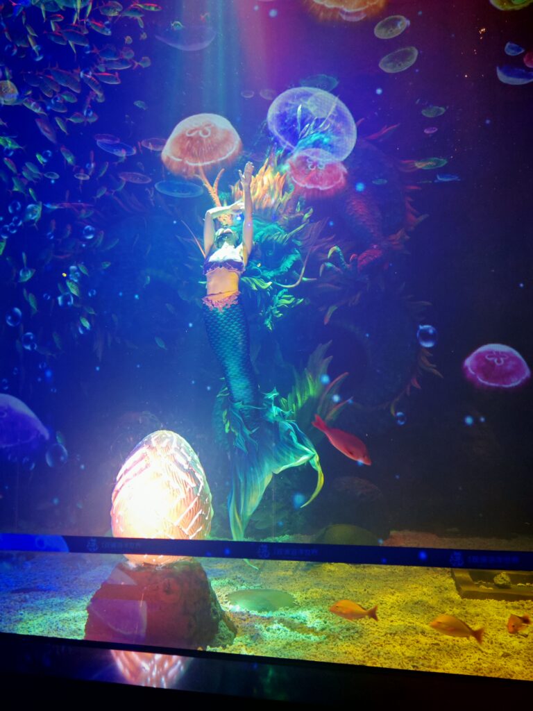 Guanlan Ocean World offers three performances twice daily: a mermaid show, a sea lion show, and a clown show. Among them, the mermaid show captivated the audience the most. The light show was amazing, with live sprinkling of water and bubbles enhancing the viewing. The performers danced with fluidity and grace.