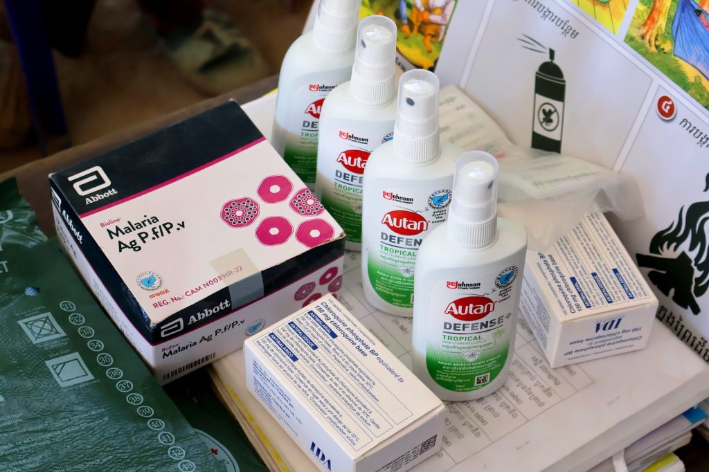 A photo taken in a Cambodian village shows a rapid test kit (top left), antimalarial medicine (bottom left) and mosquito repellent sprays (right) used to detect and prevent human malaria in the community. Treatment for human malaria is also effective against zoonotic malaria; however, challenges remain in developing accurate rapid test kits for zoonotic malaria.