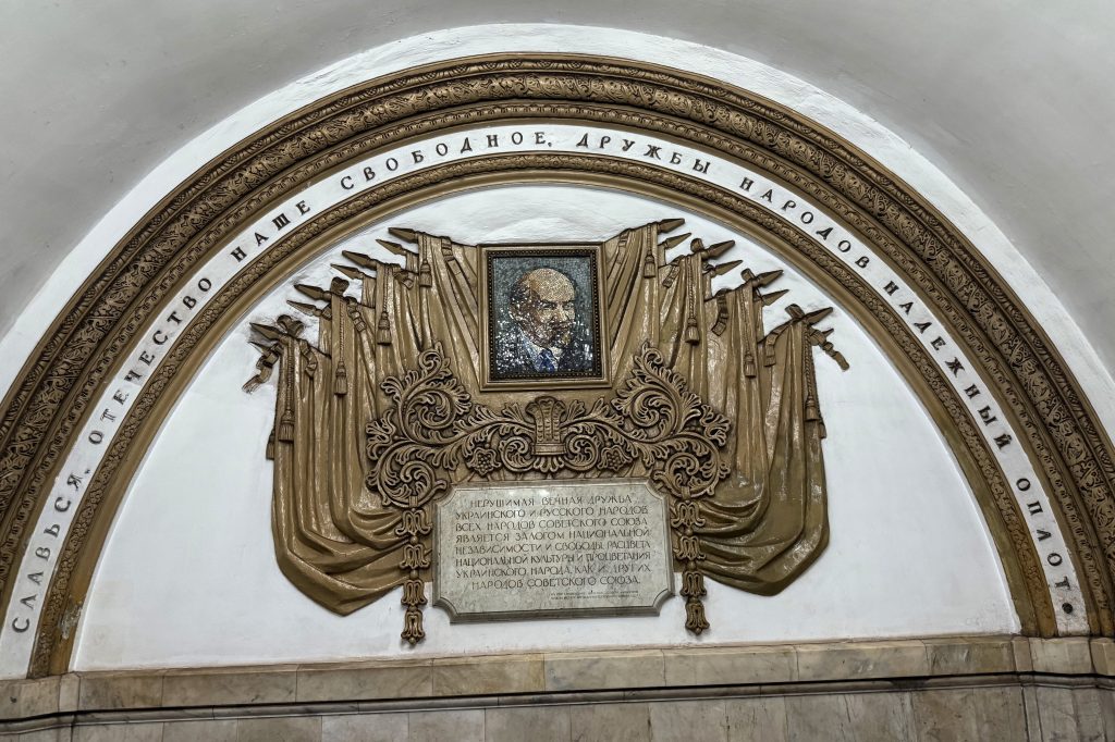 According to tourist information displayed at the station, each stop along the metro line offers a distinct visual and cultural narrative. Passengers may encounter bronze or marble statues, Roman-style arches, stained-glass windows or decorative mosaics honouring Soviet leaders, soldiers, factory workers and farmers. Ornate ceiling vaults and colourful tiled floors add to the impression that each station is a gallery in its own right.