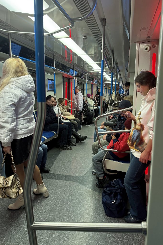 The train was crowded, mostly with locals returning home. Even so, the atmosphere remained remarkably quiet, broken only by the steady hum of the train and station announcements delivered in both Russian and English.