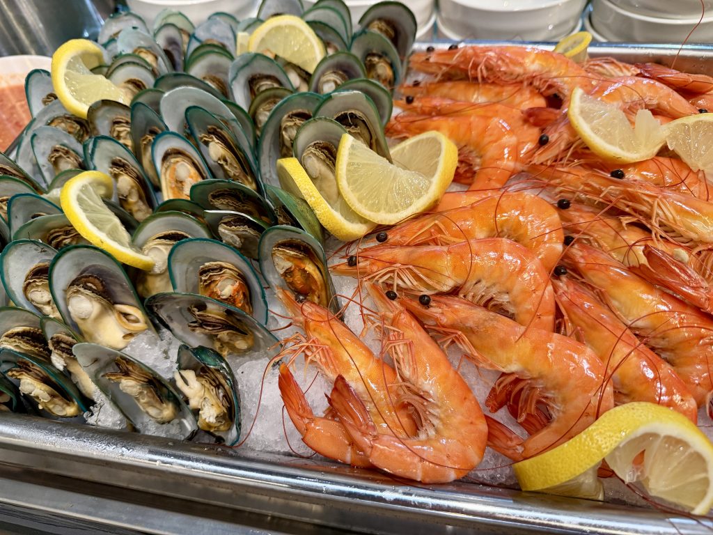 Beyond the cooked dishes, the buffet also features fresh seafood, including prawns and mussels, offering a simple, ocean-fresh contrast to the heavier flavours.