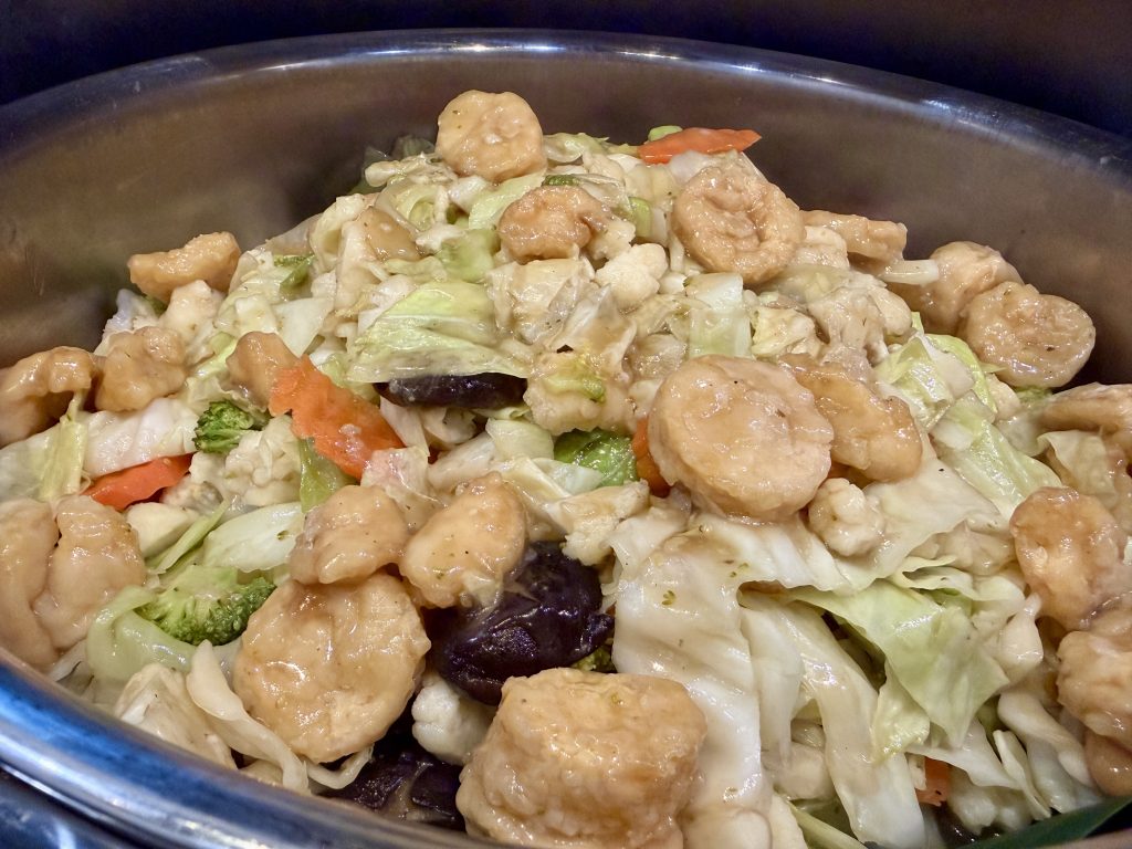 The buffet line opens with savoury dishes that immediately signal home-style warmth.