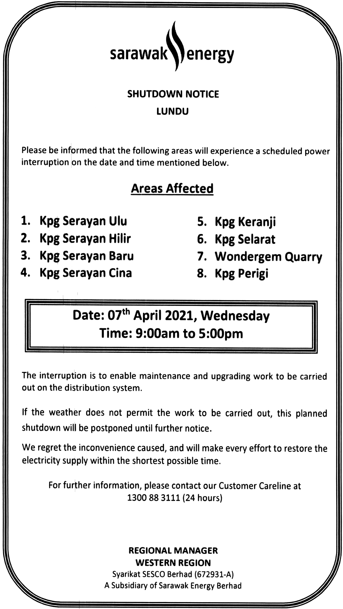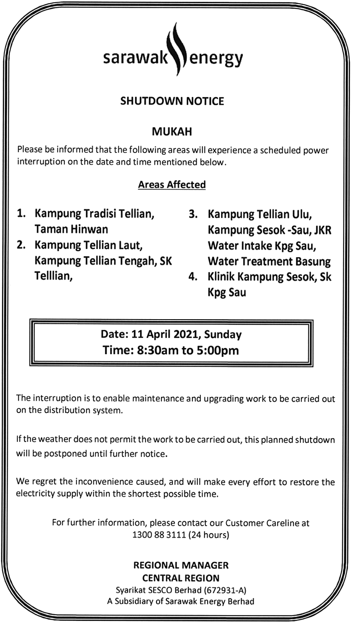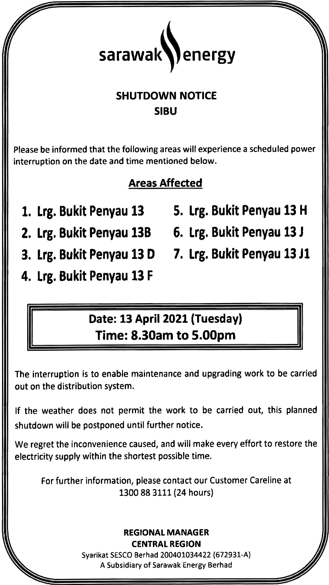 Sesco Shutdown Notice — Sibu — Lrg Bukit Panyau and surrounding areas — 13 April 2021 8.30am to 5pm 11 April 2021