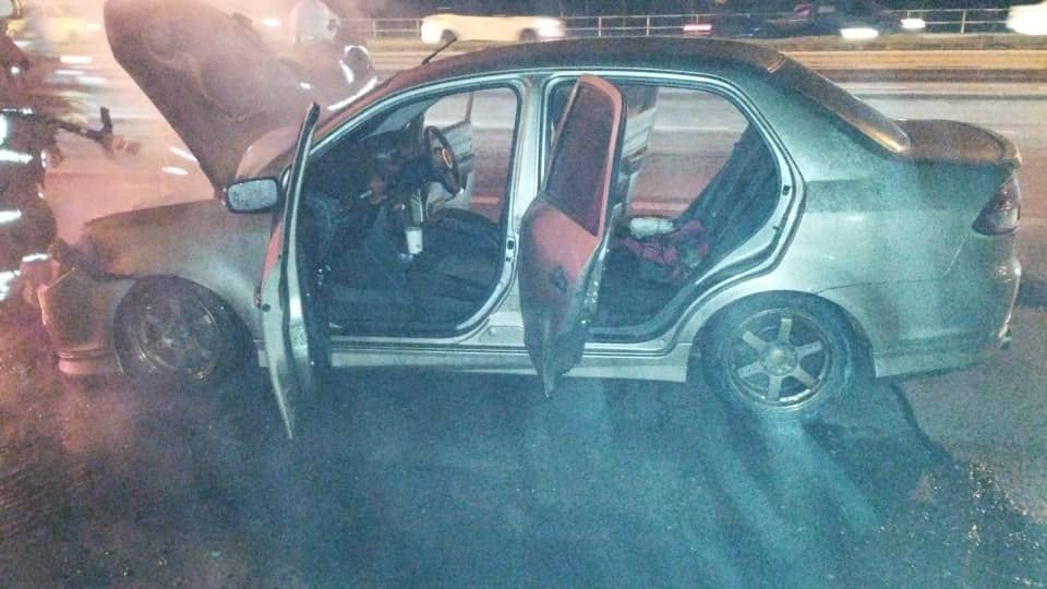 KUCHING: Two men narrowly escaped a fiery fate when their car caught fire at Kampung Tabuan Melayu here, last night (Jan 2). Both individuals, aged