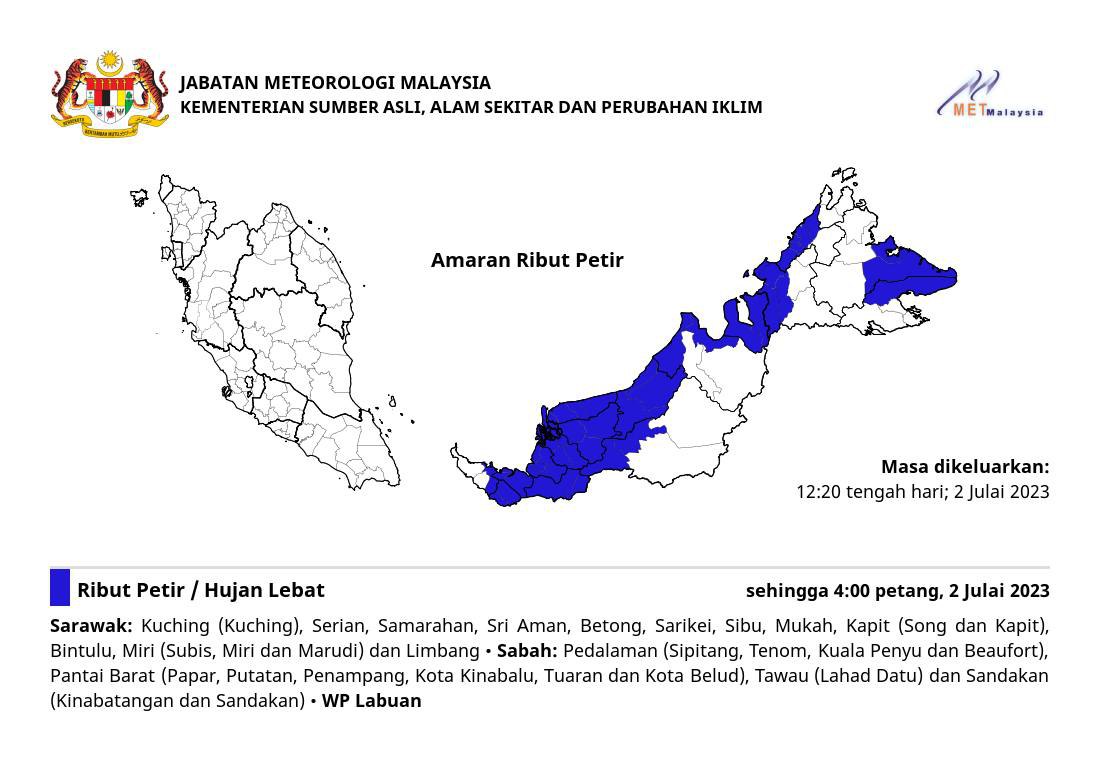 The Malaysian Meteorological Department (MetMalaysia) has issued a warning of thunderstorms and heavy rain expected to hit several areas in Sarawak until 4pm. Today (July