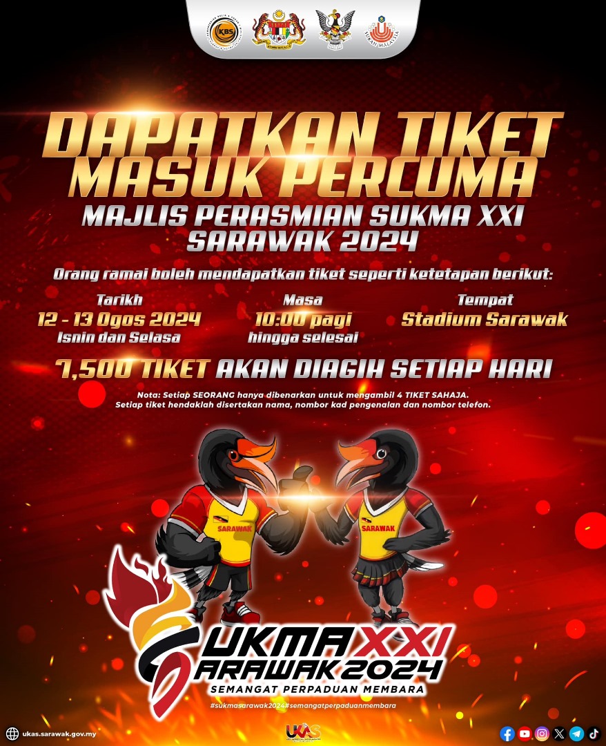 KUCHING: Free entrance tickets to the opening ceremony of the 2024 Sarawak Malaysia Games (SUKMA) will be distributed on Aug 12 and 13 at Sarawak