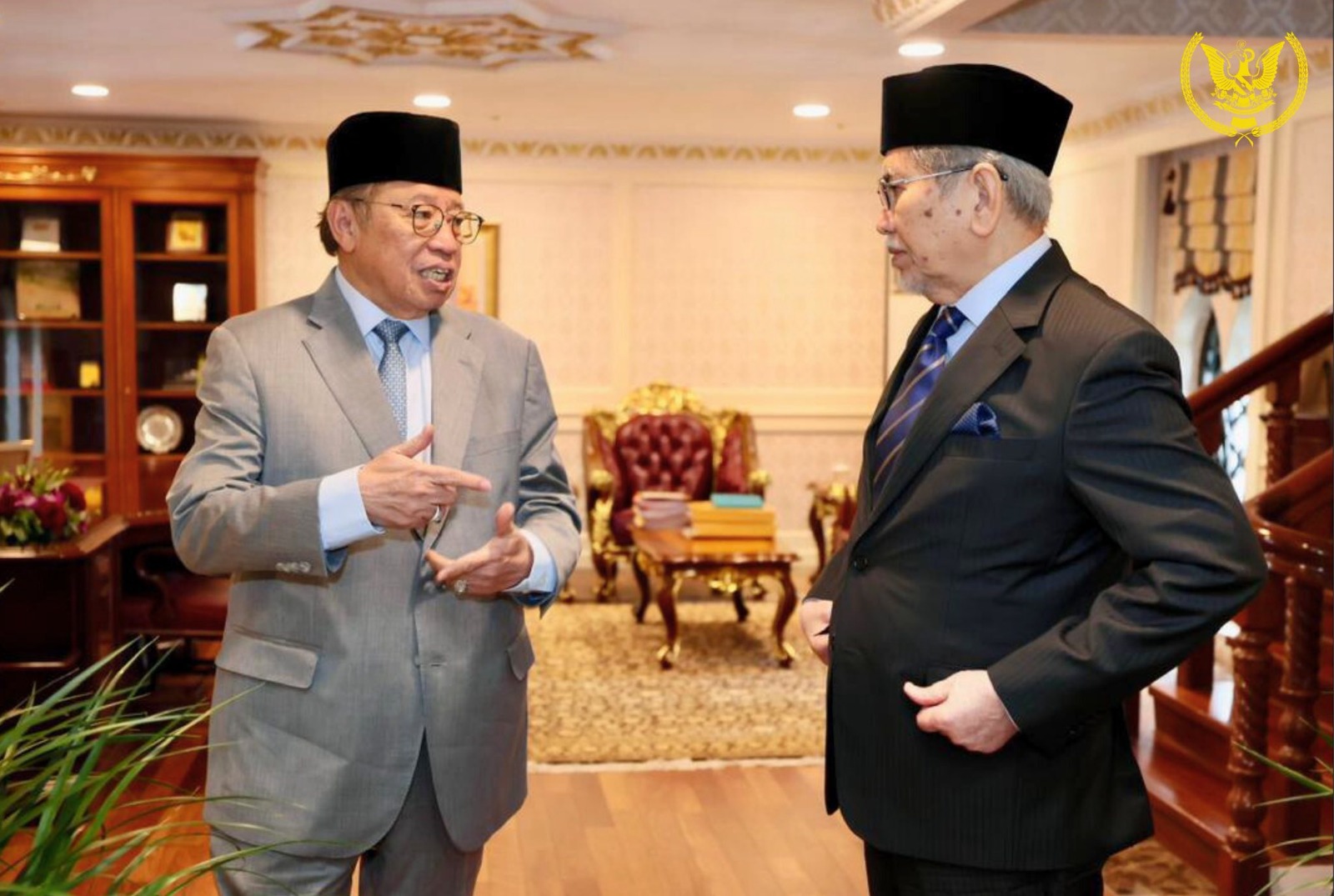 KUCHING: Head of State Tun Pehin Sri Dr Wan Junaidi receives Premier Datuk Patinggi Tan Sri Abang Johari for a pre-council meeting at the Astana