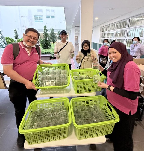 Chris Cheng (left) of SCAN with community members showcasing freshly packed microgreens for Sarawak General Hospital.