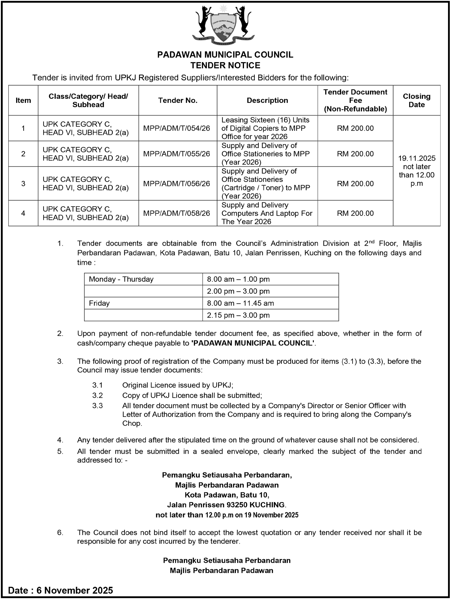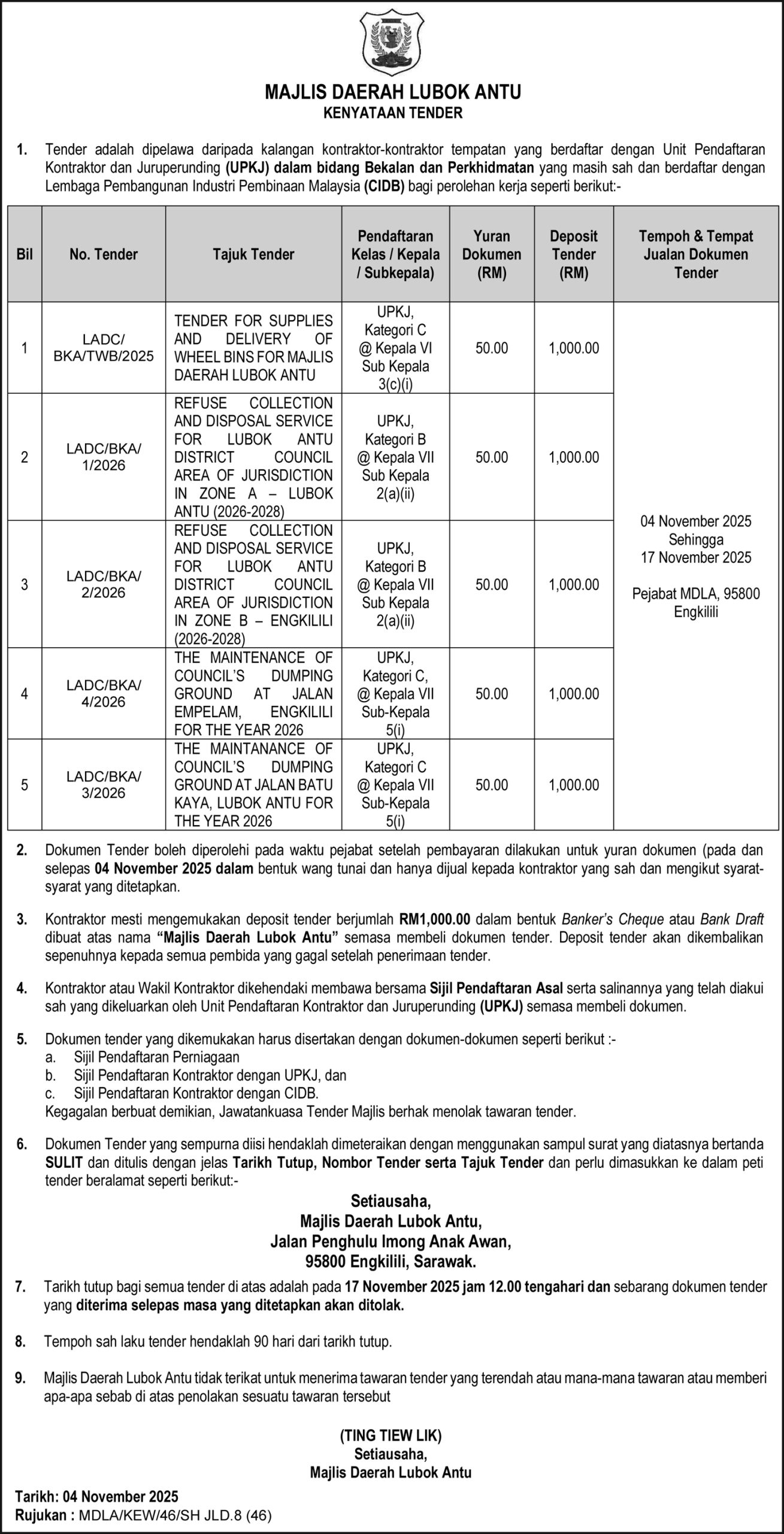 MAJLIS DAERAH LUBOK ANTU (KENYATAAN TENDER)