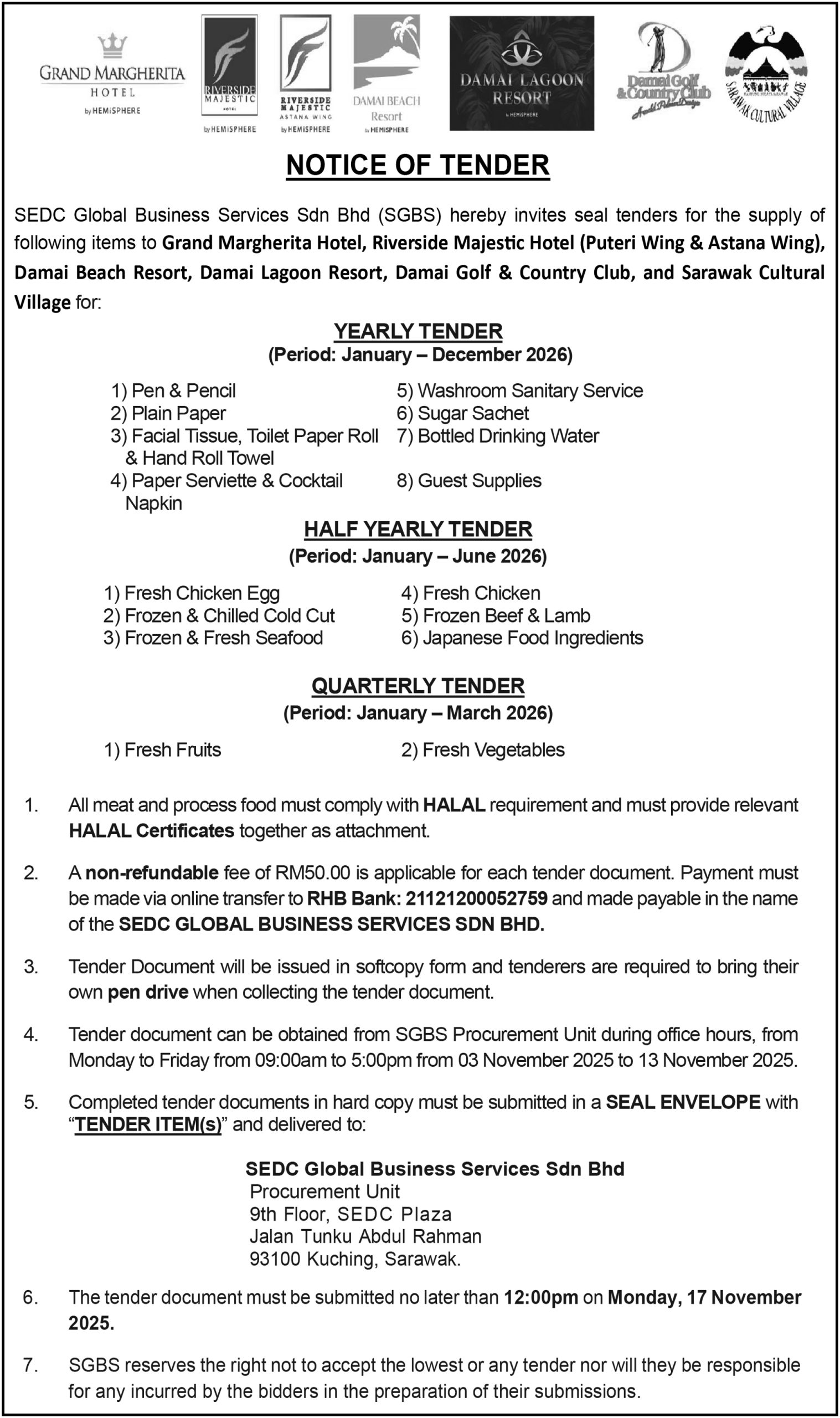 SEDC GLOBAL BUSINESS (NOTICE OF TENDER)