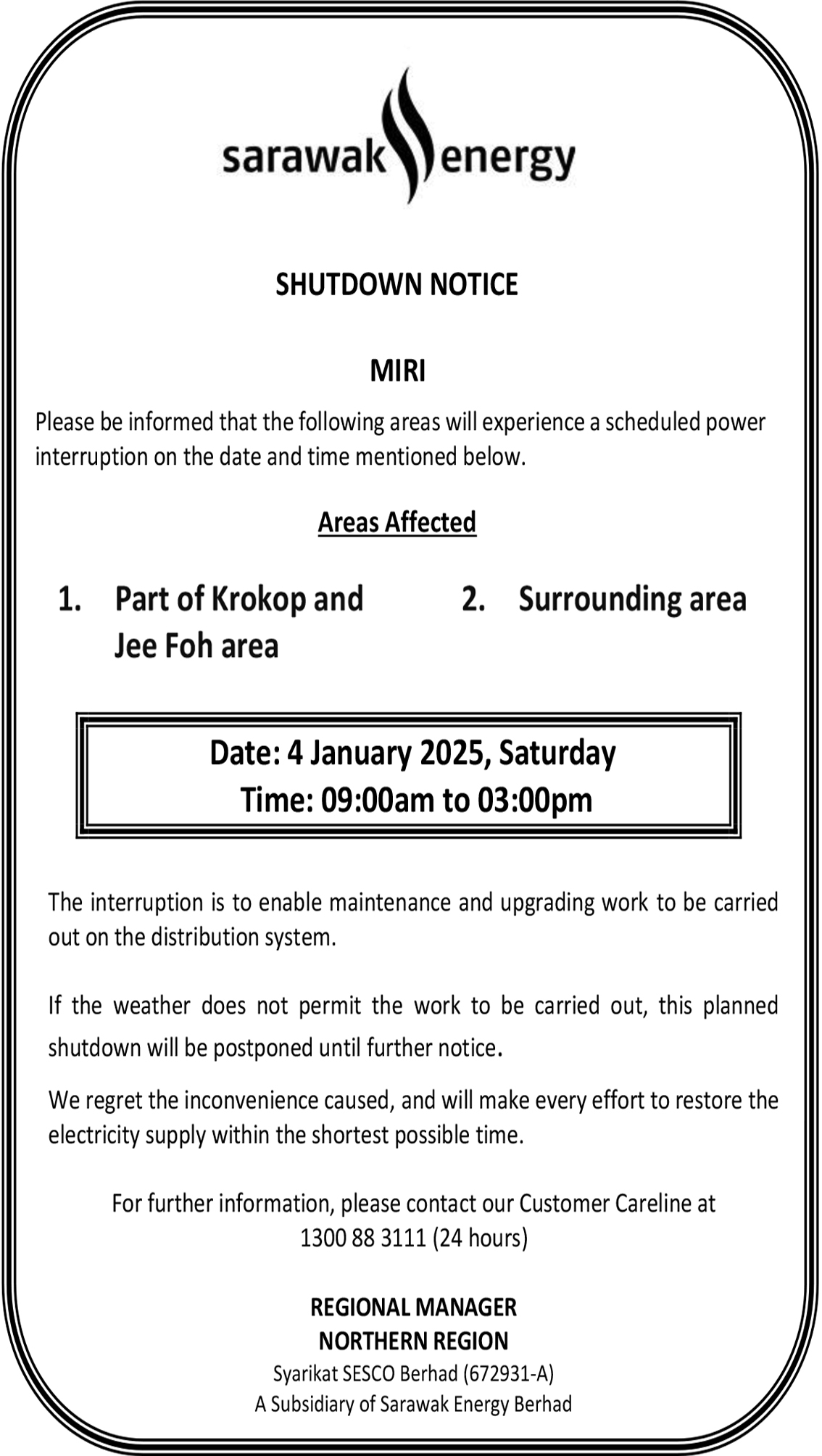 SESCO SHUTDOWN NOTICE MIRI