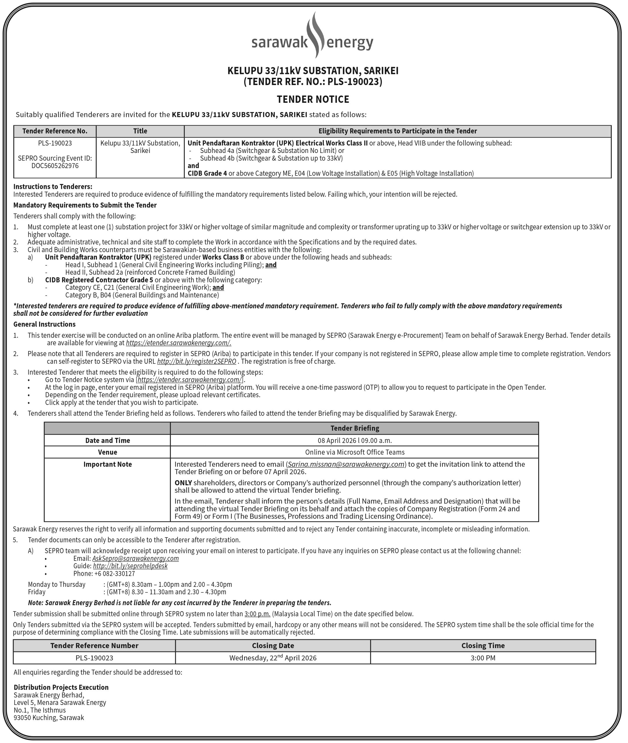 SEB TENDER NOTICE