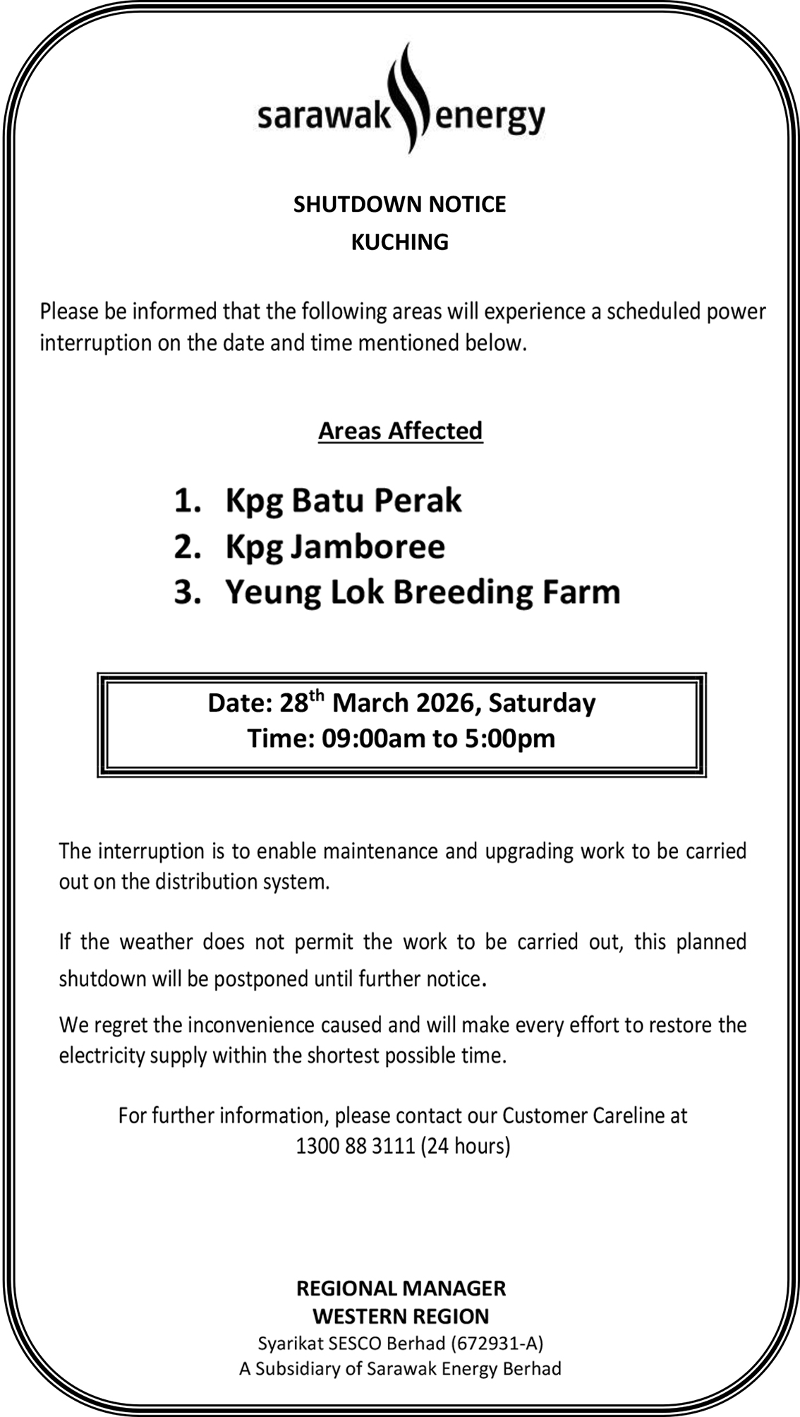 SESCO KUCHING SHUTDOWN NOTICE