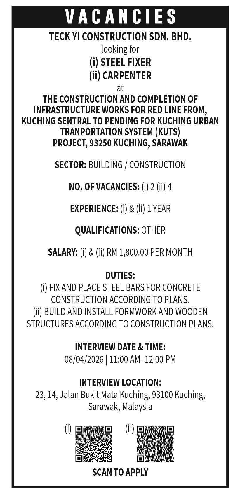 LABOUR VACANCIES (TECK YI)
