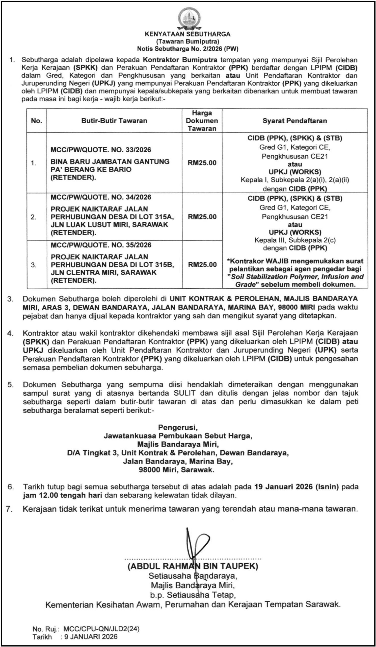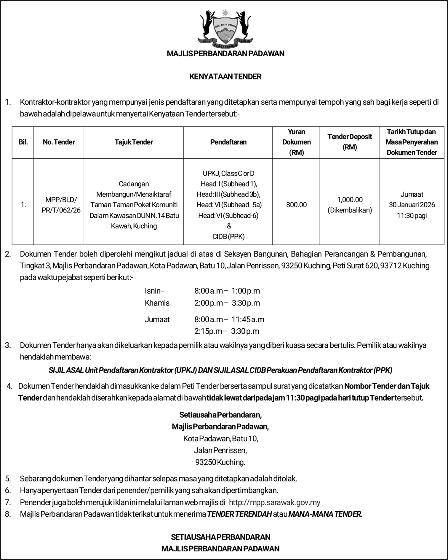 KENYATAAN TENDER (MAJLIS DAERAH DALAT & MUKAH)