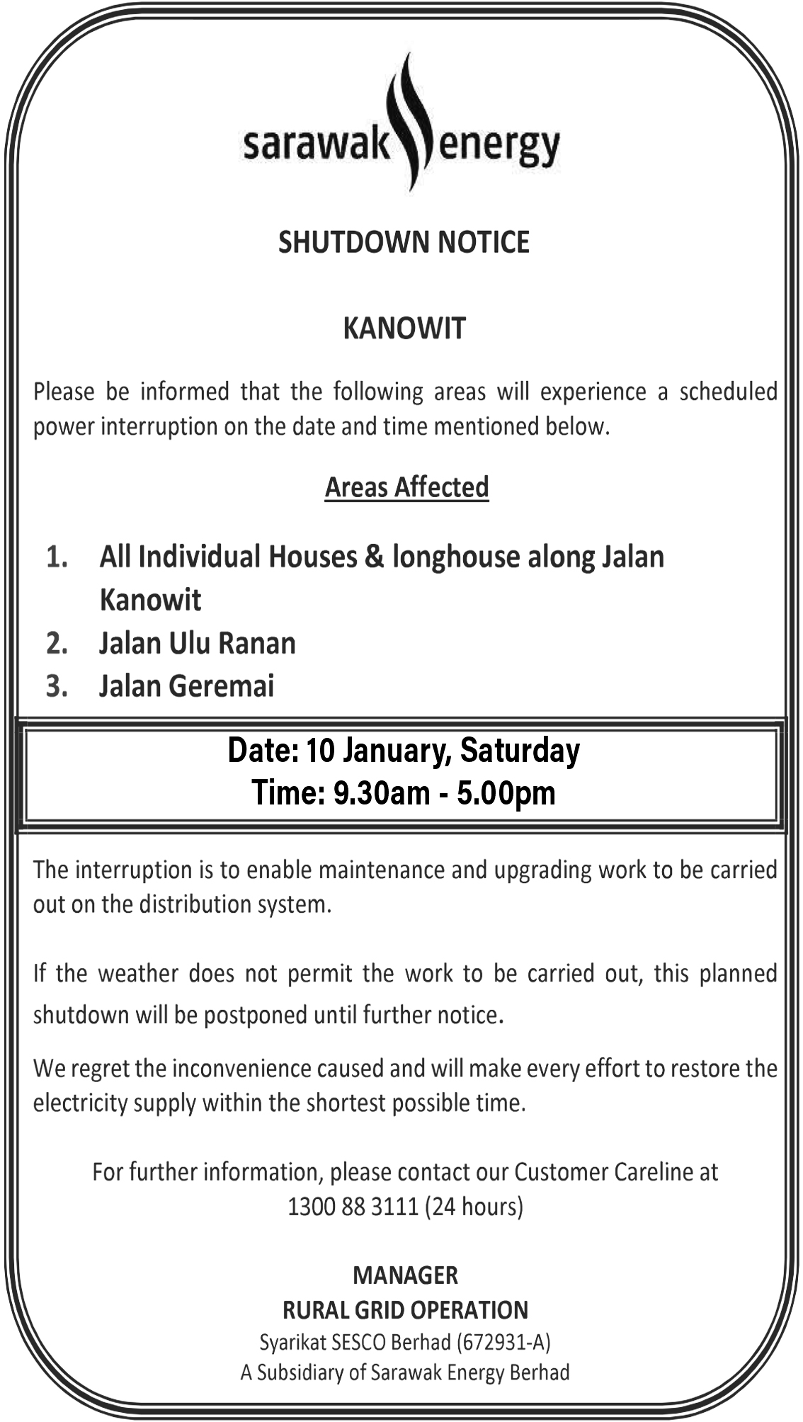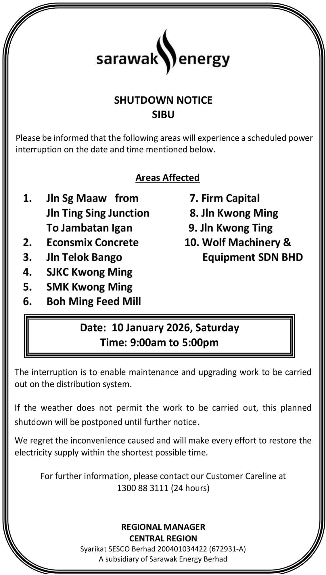 SESCO SIBU SHUTDOWN NOTICE