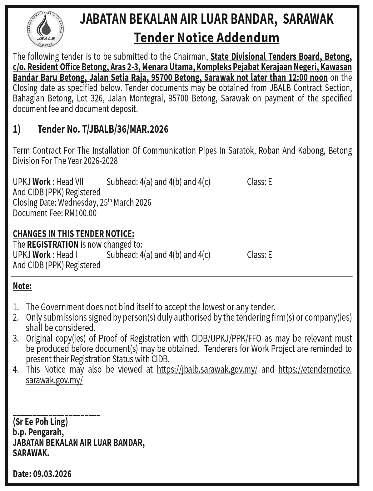 JABATAN BEKALAN AIR TENDER NOTICE