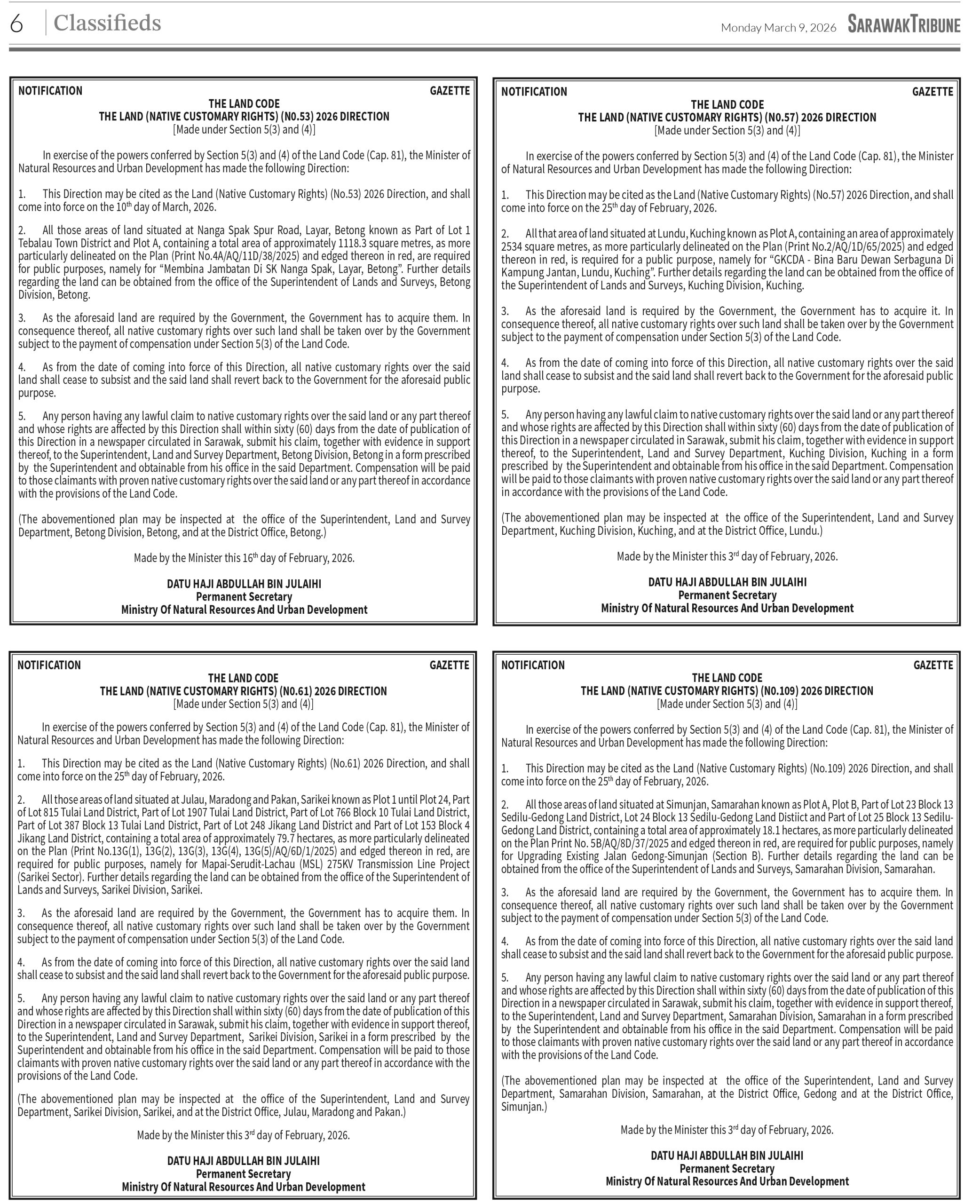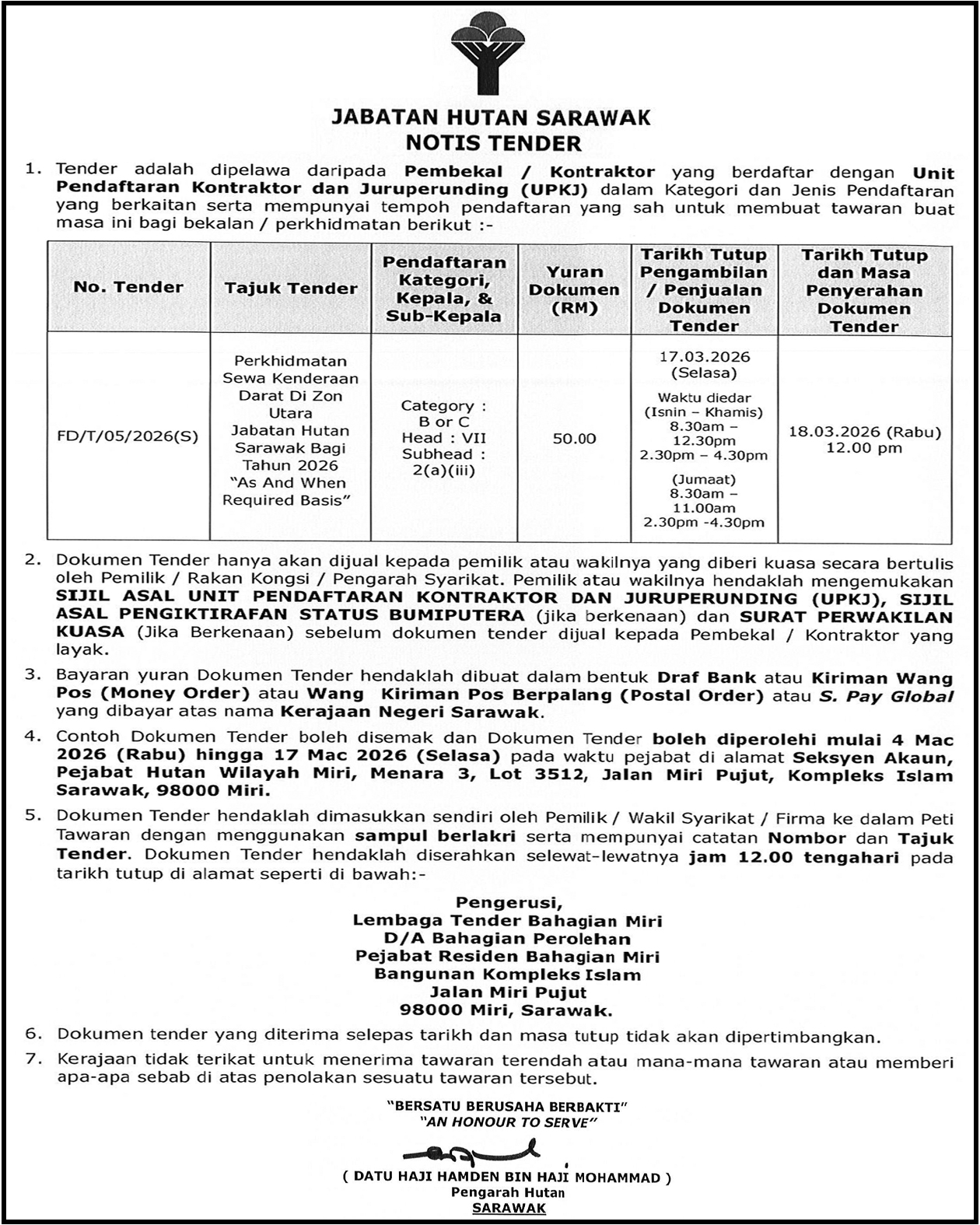 JABATAN HUTAN SARAWAK (TENDER NOTICE)