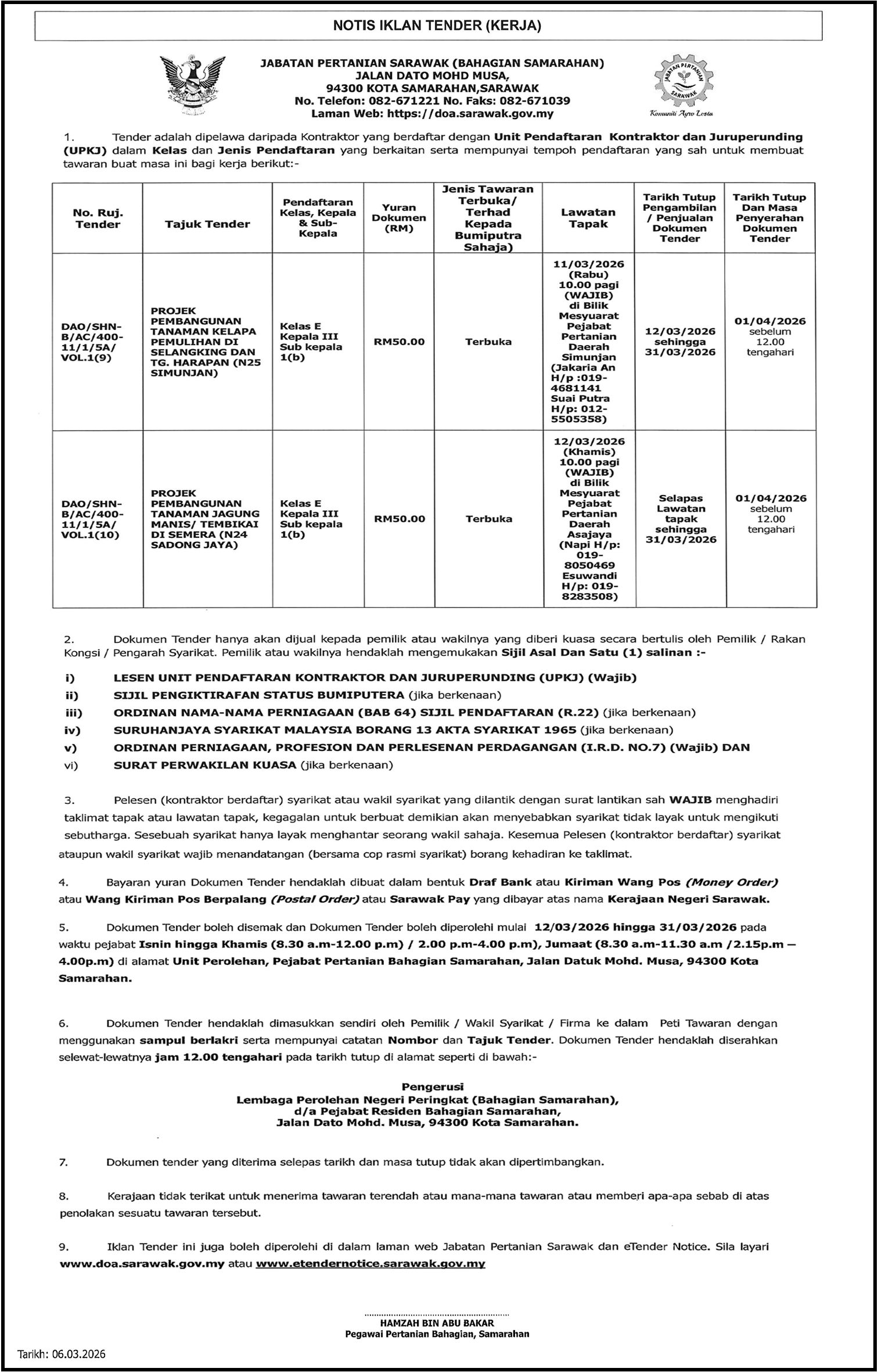 JABATAN PERTANIAN NOTIS IKLAN TENDER