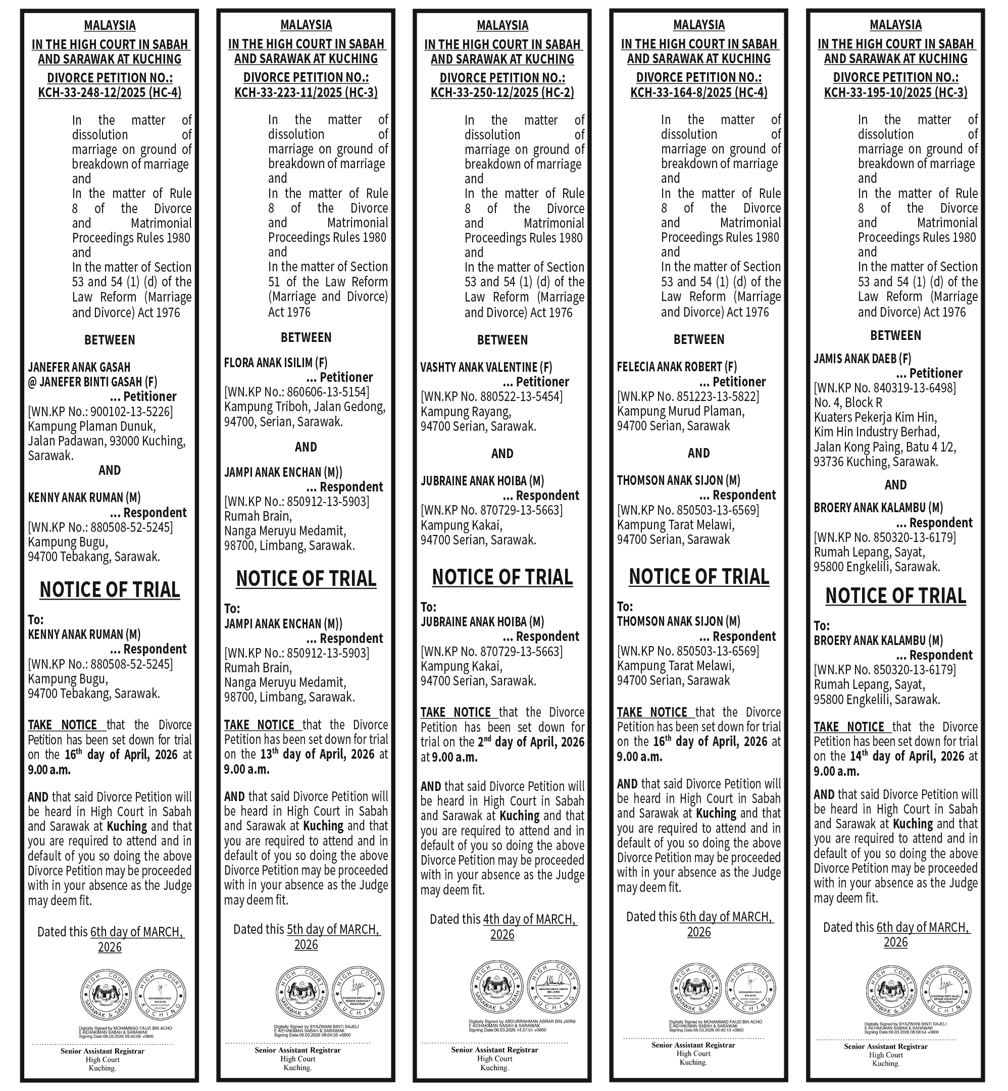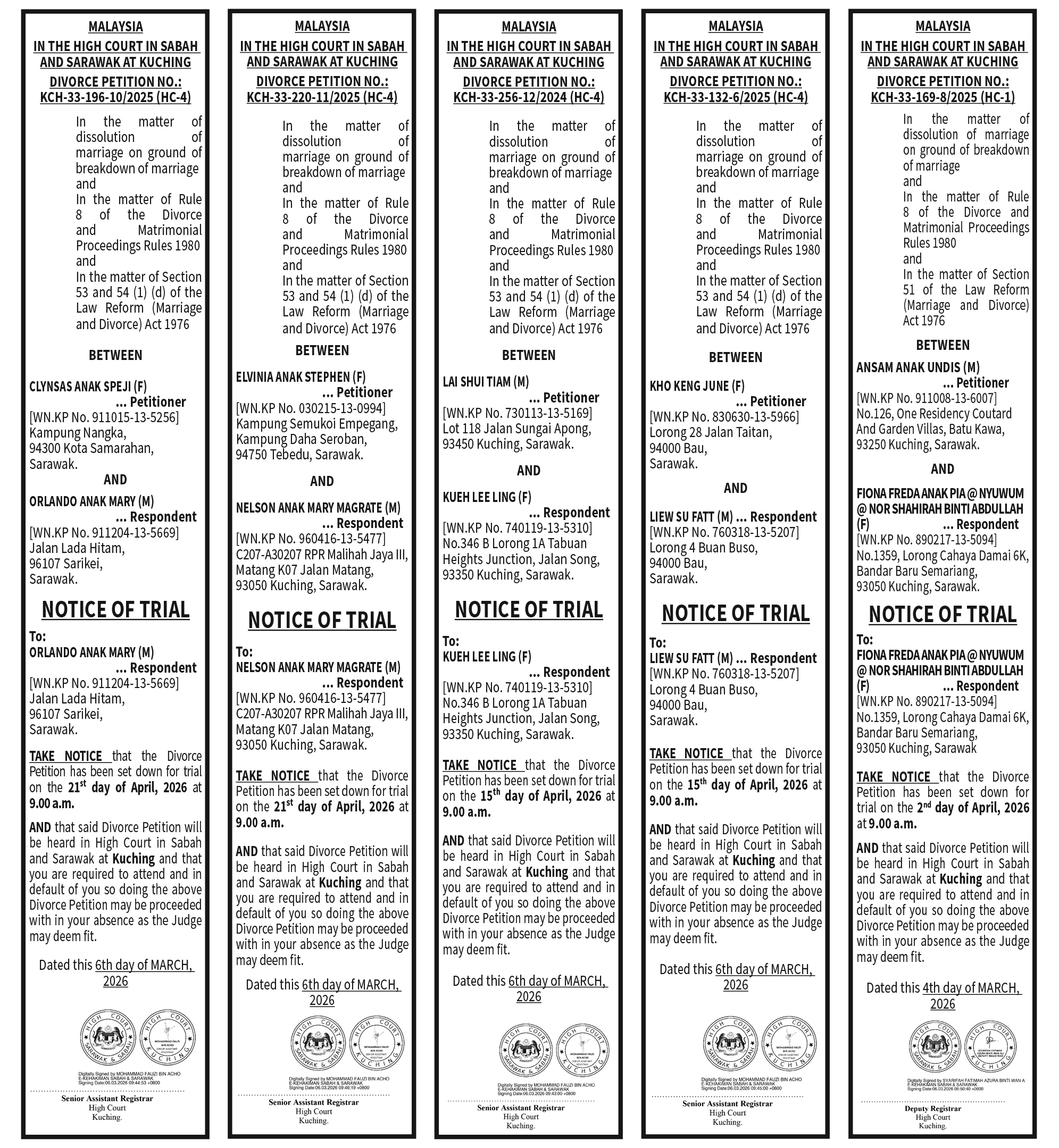 DIVORCE NOTICE OF TRIAL 5(2)