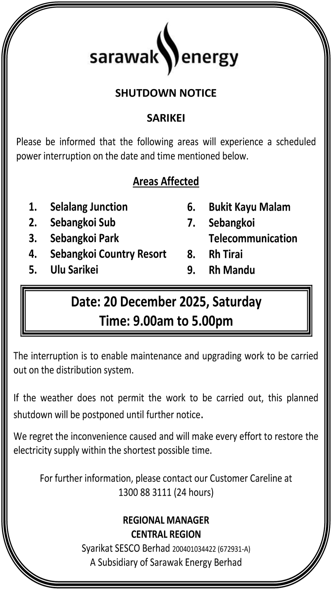 SESCO SARIKEI SHUTDOWN NOTICE (SELALANG)
