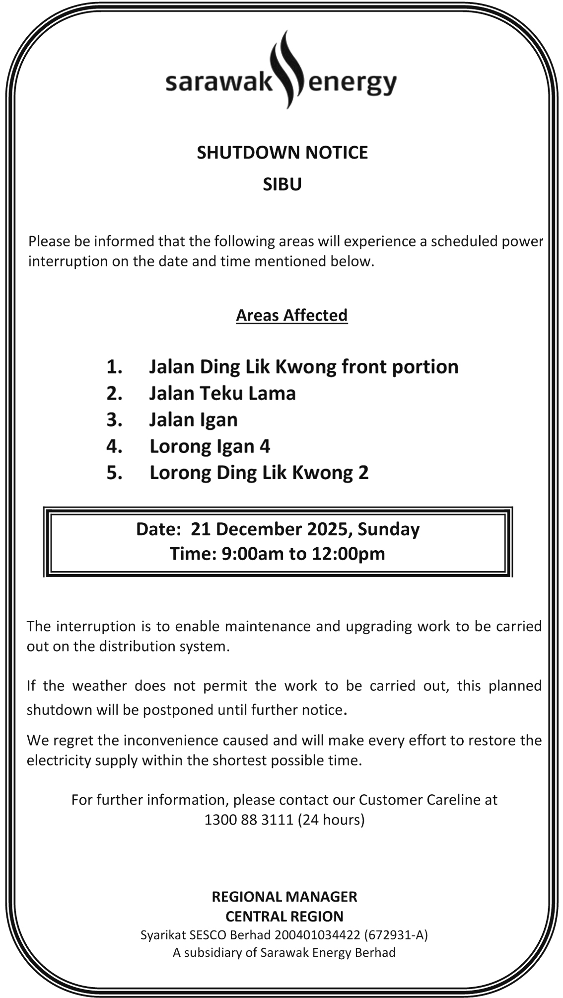 SESCO SIBU SHUTDOWN NOTICE (JLN DING LIK KWONG)