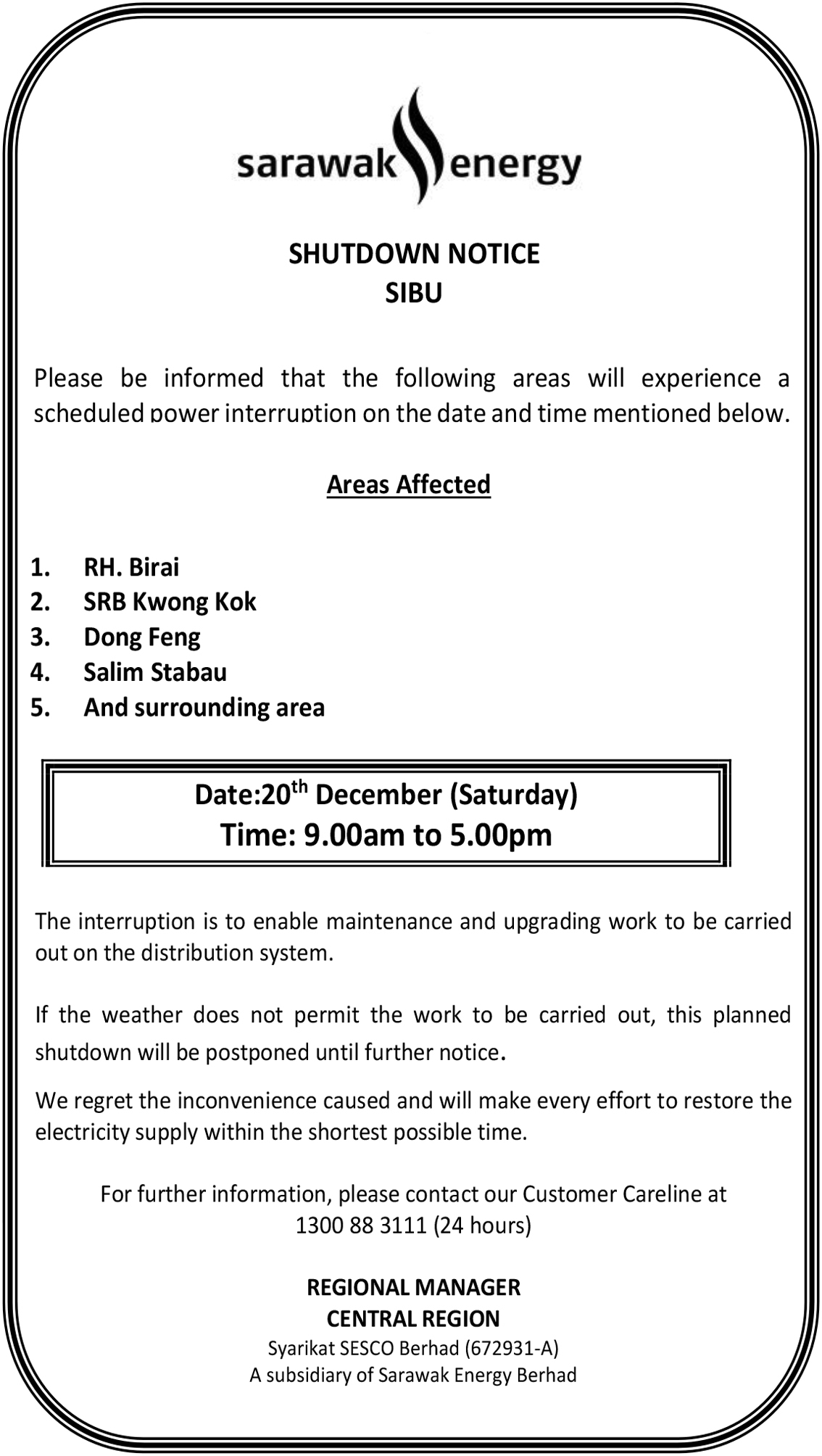 SESCO SIBU SHUTDOWN NOTICE (RH BIRAI)