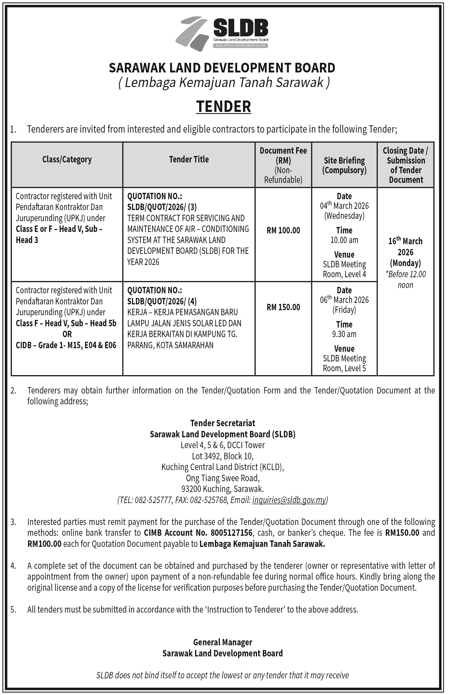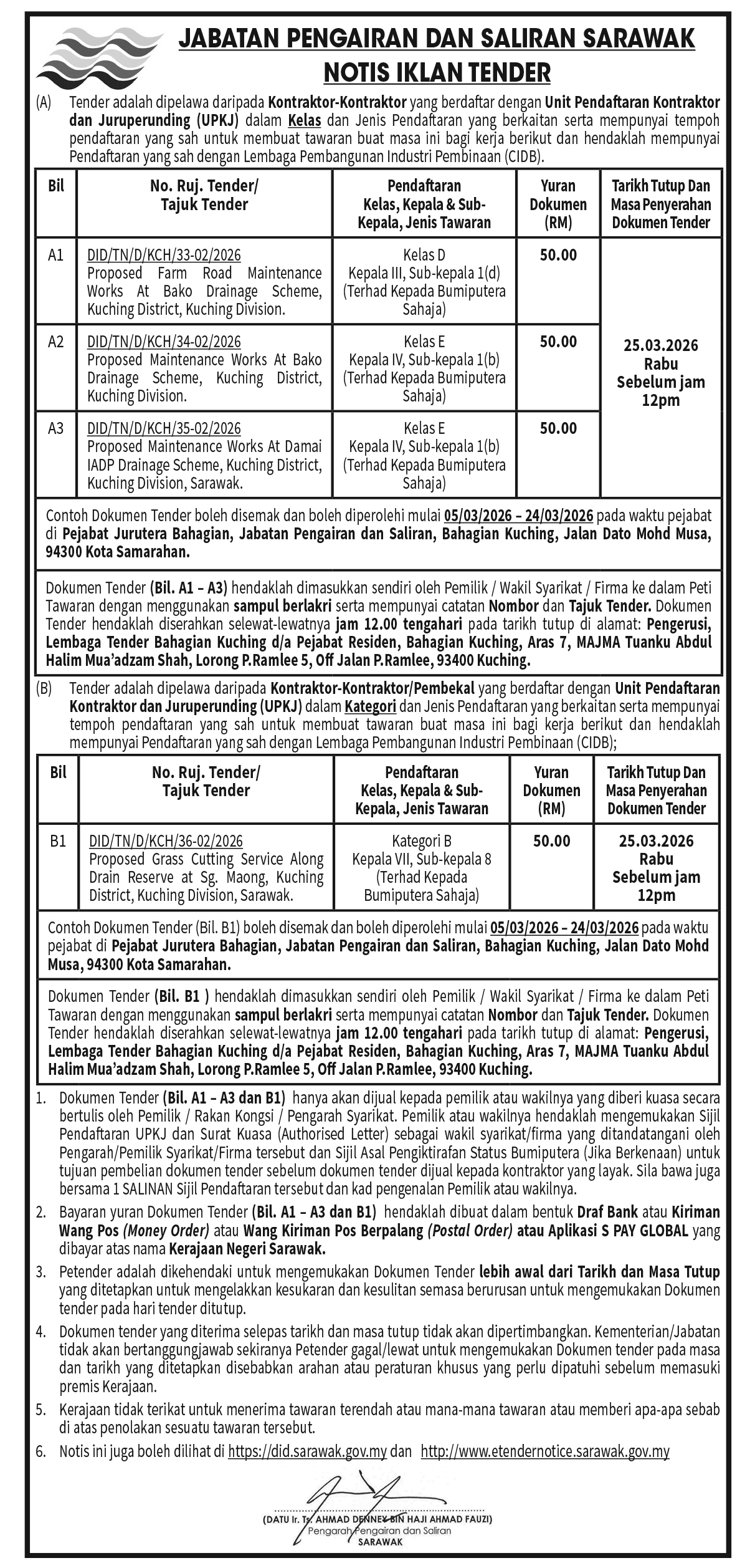 JABATAN PENGAIRAN DAN SALIARAN SARAWAK (NOTIS IKLAN TENDER)