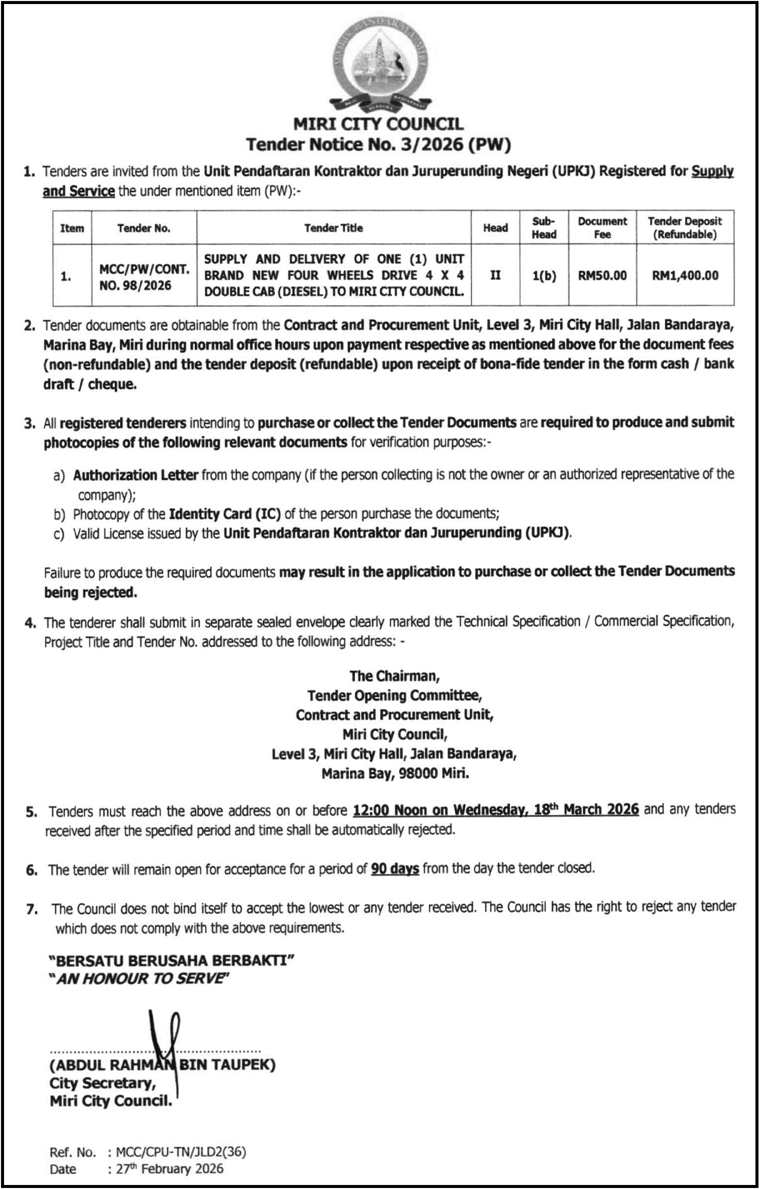MCC TENDER NOTICE NO. 3
