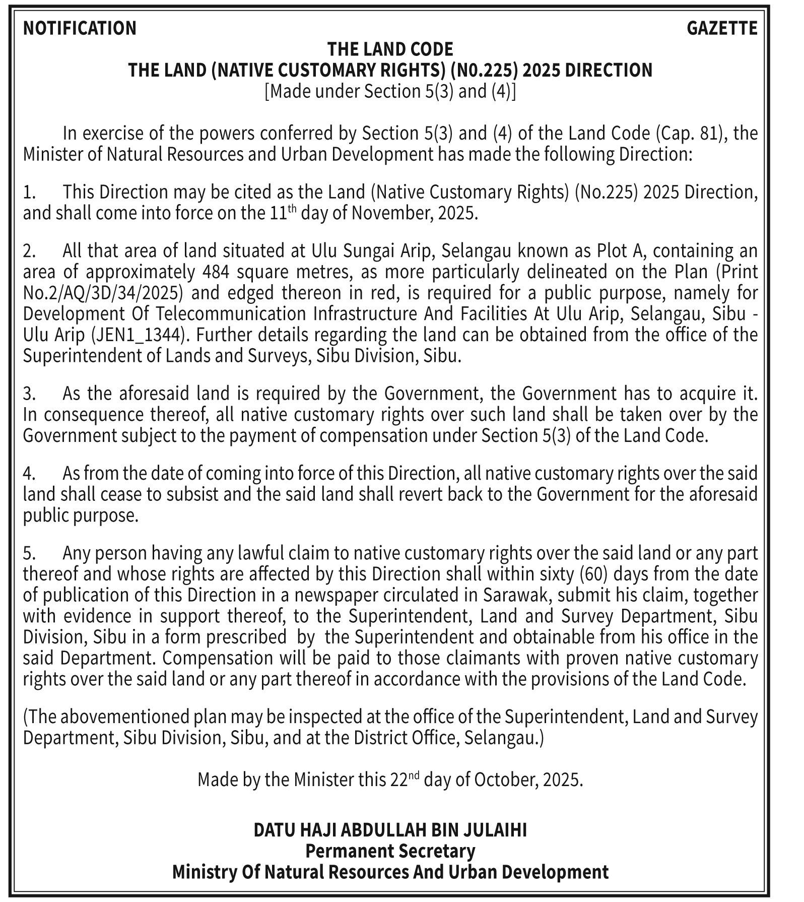 THE LAND CODE NO. 225