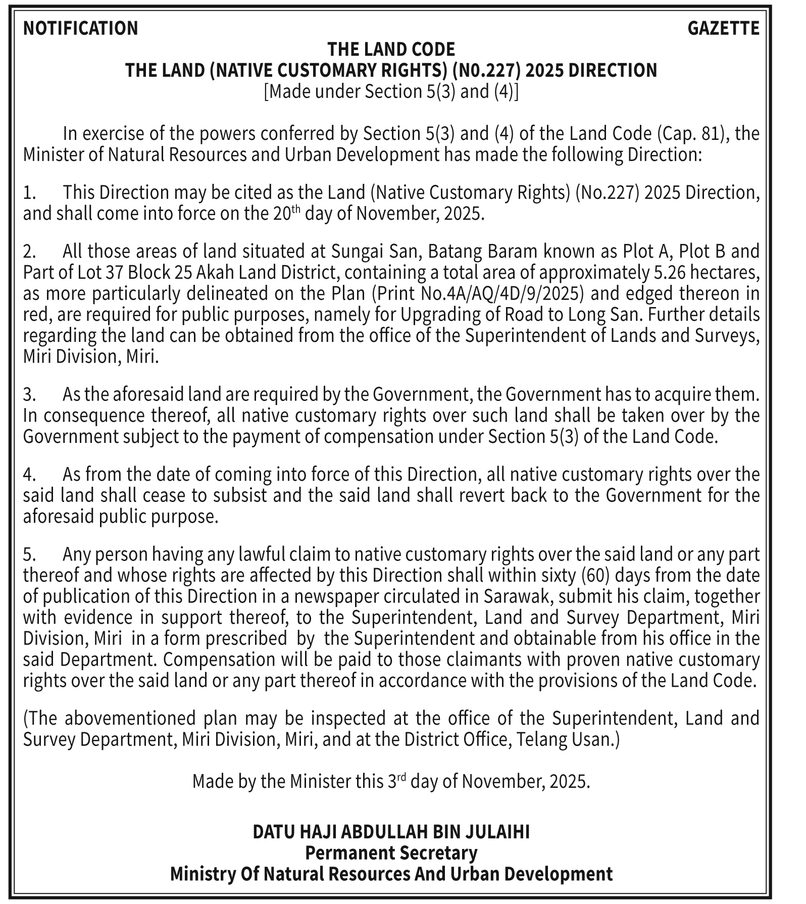 THE LAND CODE NO. 227