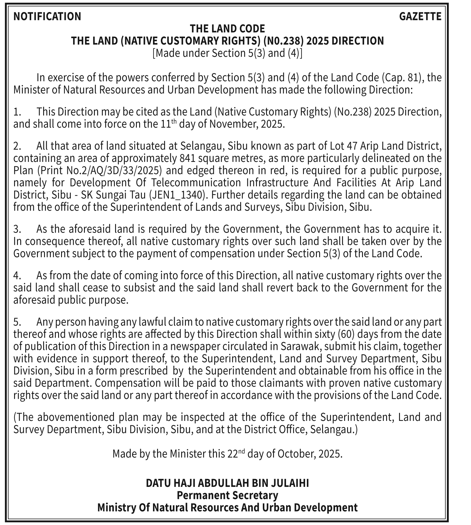 THE LAND CODE NO. 238