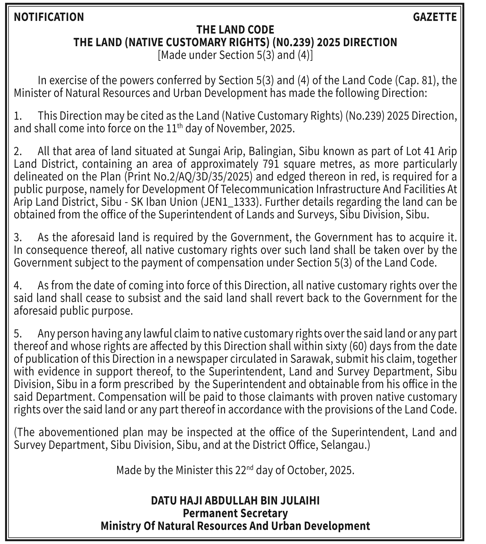 THE LAND CODE NO. 239
