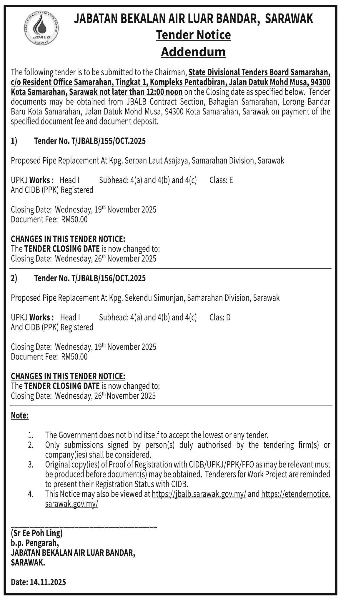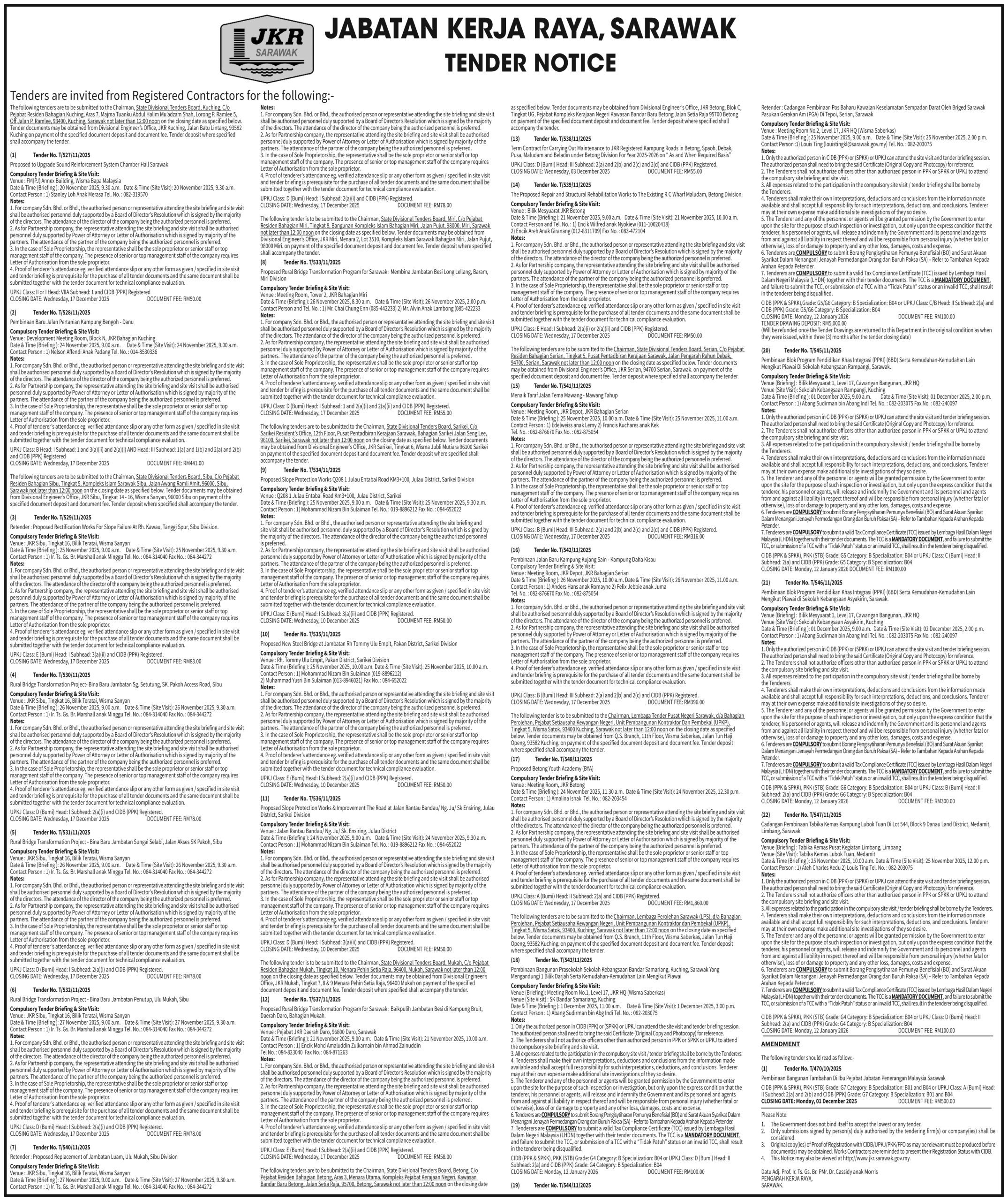 JABATAN KERJA RAYA SARAWAK (TENDER NOTICE)