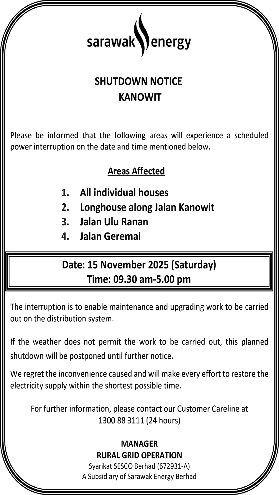 SESCO SARIKEI SHUTDOWN NOTICE (REPOK RD)