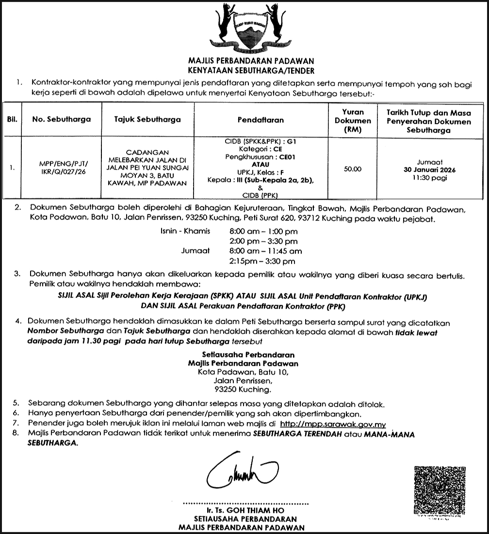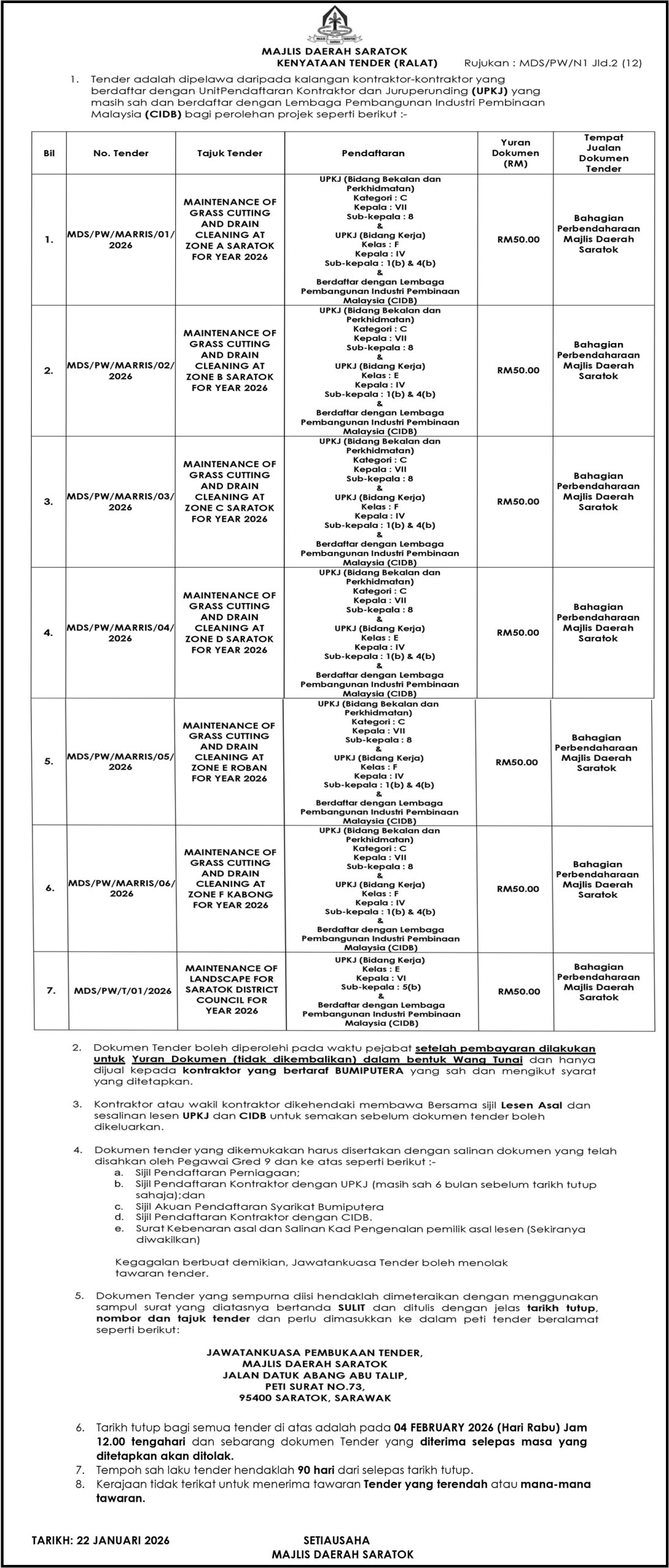 MAJLIS DAERAH SARATOK (KENYATAAN TENDER RALAT)