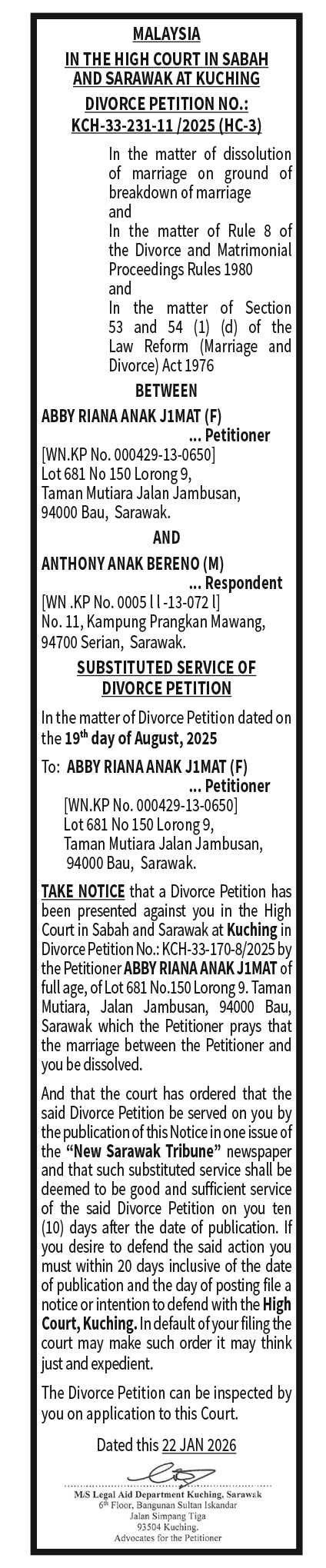 DIVORCE SUBSTITUTED NOTICE