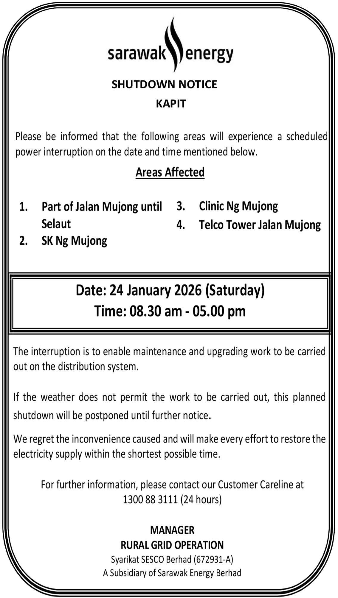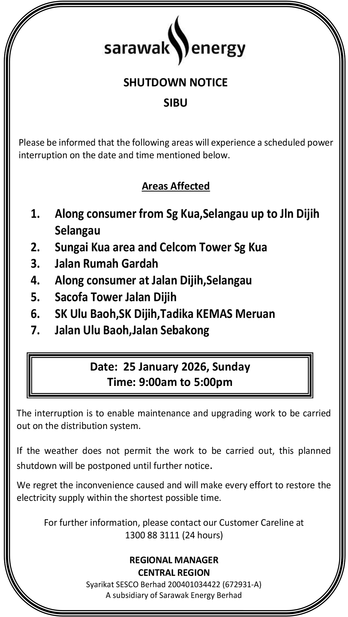 SESCO SIBU SHUTDOWN NOTICE (SELANGAU)