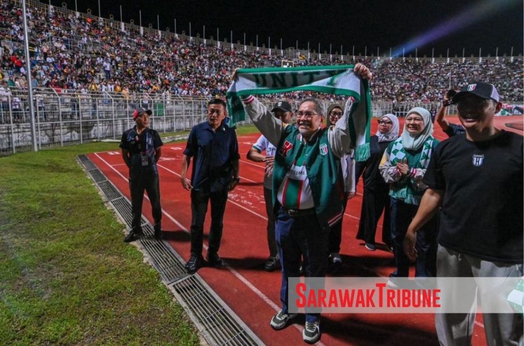 At half-time, Head of State Tun Pehin Sri Dr Wan Junaidi Tuanku Jaafar and Toh Puan Datuk Patinggi Fauziah Mohd Sanusi, clad in Kuching City FC jerseys and jackets, beamed as they waved and acknowledged the cheering crowd.