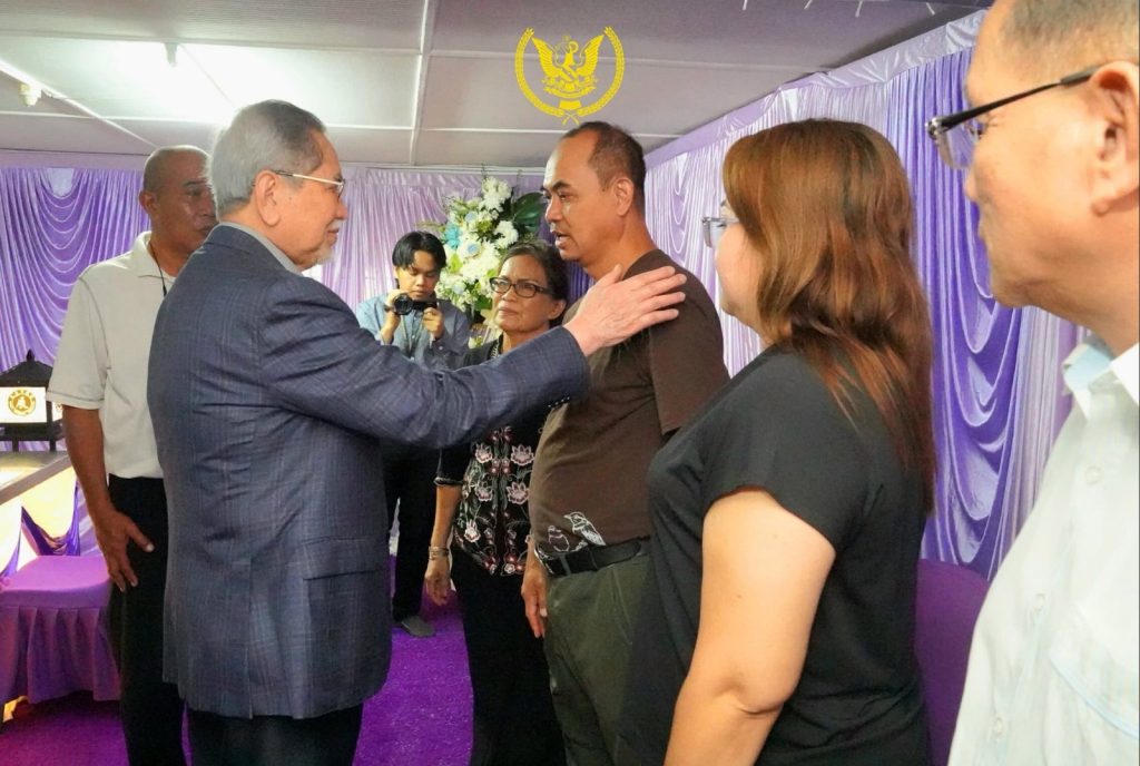 KUCHING: Head of State, Tun Pehin Sri Dr Wan Junaidi Tuanku Jaafar, and his wife, Toh Puan Datuk Patinggi Fauziah Mohd Sanusi, paid their last respects to the late Datuk Dr Madeline Berma at her family home in Kampung Siol Kandis, Petra Jaya, this morning (Jan. 1).