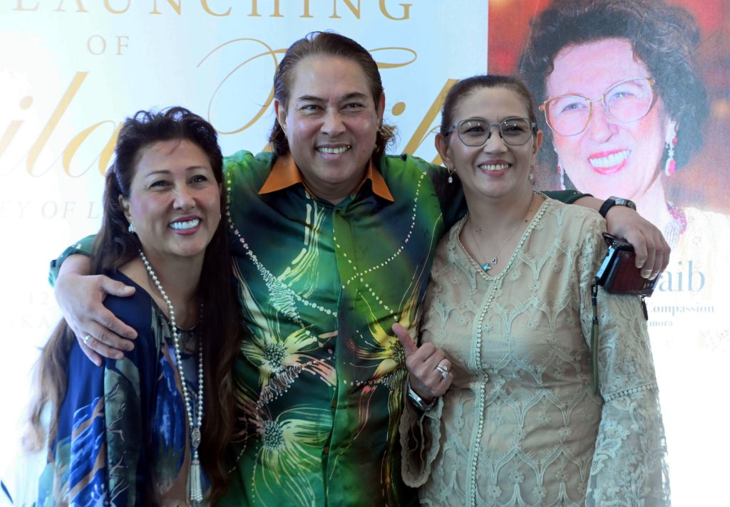 Datuk Hanifah Hajar Taib (right) and Jamilah Hamidah Taib (centre) unveiling the book ‘ Laila Taib-Her Journey of Love and Compassion’ wrapped in a ‘keringkam’ veil while Datuk Seri Mahmud Abu Bekir Taib (left) looks on.
