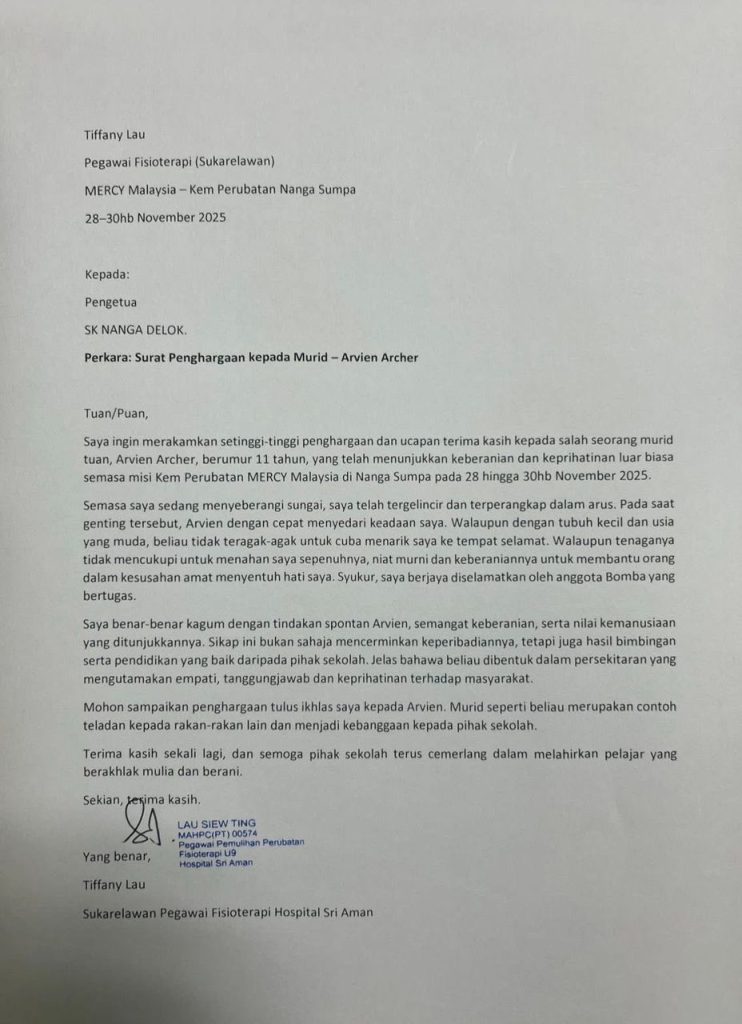 In a letter sighted by Sarawak Tribune, Tiffany Lau, a volunteer physiotherapy officer from Hospital Sri Aman, commended Arvien Archer for his extraordinary courage and compassion during the MERCY Malaysia Medical Camp held in Nanga Sumpa from Nov 28 to 30.