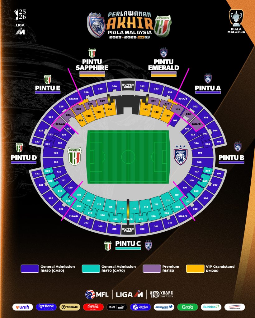 MFL also shared the ticket categories have been structured across four tiers – General Admission (GA50) at RM50, General Admission (GA70) at RM70, Premium seats at RM150 and VIP Grandstand at RM200, reflecting a broad access range for supporters.