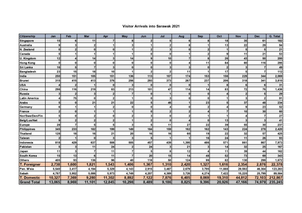 According to data on 2021 domestic tourist arrivals published by the ministry, from October to December 2021, there were 87,784 from the Peninsular Malaysia while arrivals from Sabah (October 2021 to Dececember 2021) accounted for 48,441.