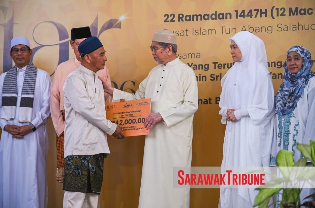 Tun Pehin Sri Wan Junaidi Tuanku Jaafar hand over the assistance to representative from respective mosque while others look on at the Iftar Perdana 2026 at Tun Anang Salahuddin Islamic Centre (PITAS) in Unimas. Photo: Mohd Alif Noni