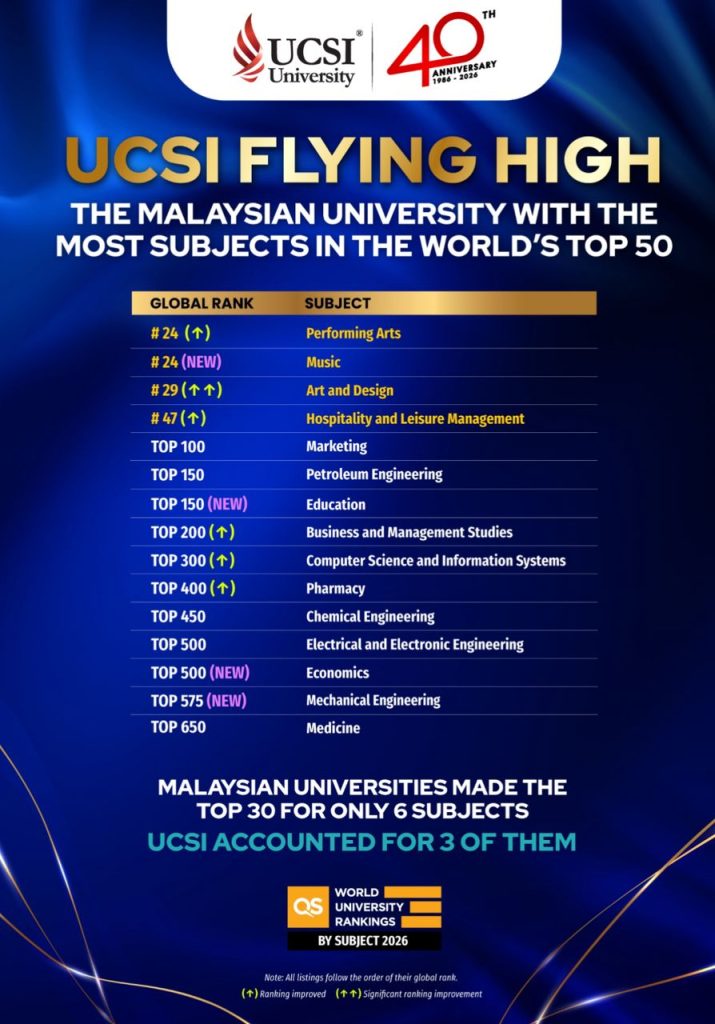 “The latest rankings also mark a new milestone for UCSI because this is the first time the university has made it into the top 50 for four subjects. The previous record was two.