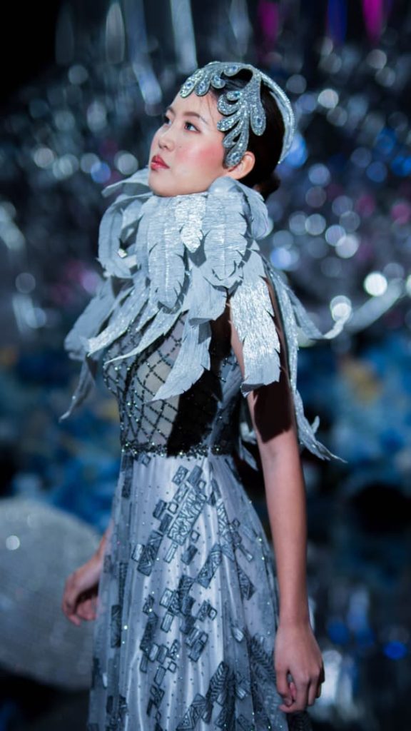 One of the most memorable pieces from the collection was a silver A-line gown adorned with blockchain-inspired embroidery. Paired with a crystal-embellished helmet and an oversized silver leaf neckpiece, the look crowned the model as a Cyber Queen — regal, radiant, and untouchably powerful.